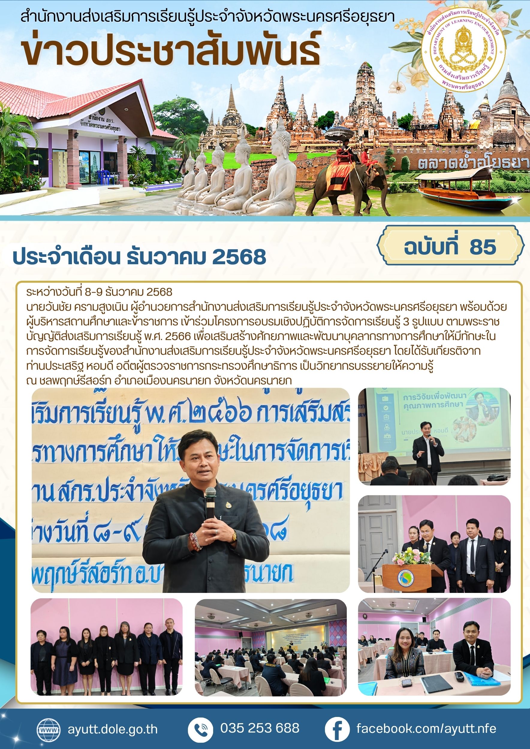 นายวันชัย ครามสูงเนิน ผู้อำนวยการสำนักงานส่งเสริมการเรียนรู้ประจำจังหวัดพระนครศรีอยุธยา พร้อมด้วยผู้บริหารสถานศึกษาและข้าราชการ เข้าร่วมโครงการอบรมเชิงปฏิบัติการจัดการเรียนรู้ 3 รูปแบบ ตามพระราชบัญญัติส่งเสริมการเรียนรู้ พ.ศ. 2566 เพื่อเสริมสร้างศักยภาพและพัฒนาบุคลากรทางการศึกษาให้มีทักษะในการจัดการเรียนรู้ของสำนักงานส่งเสริมการเรียนรู้ประจำจังหวัดพระนครศรีอยุธยา โดยได้รับเกียรติจากท่านประเสริฐ หอมดี อดีตผู้ตรวจราชการกระทรวงศึกษาธิการ เป็นวิทยากรบรรยายให้ความรู้