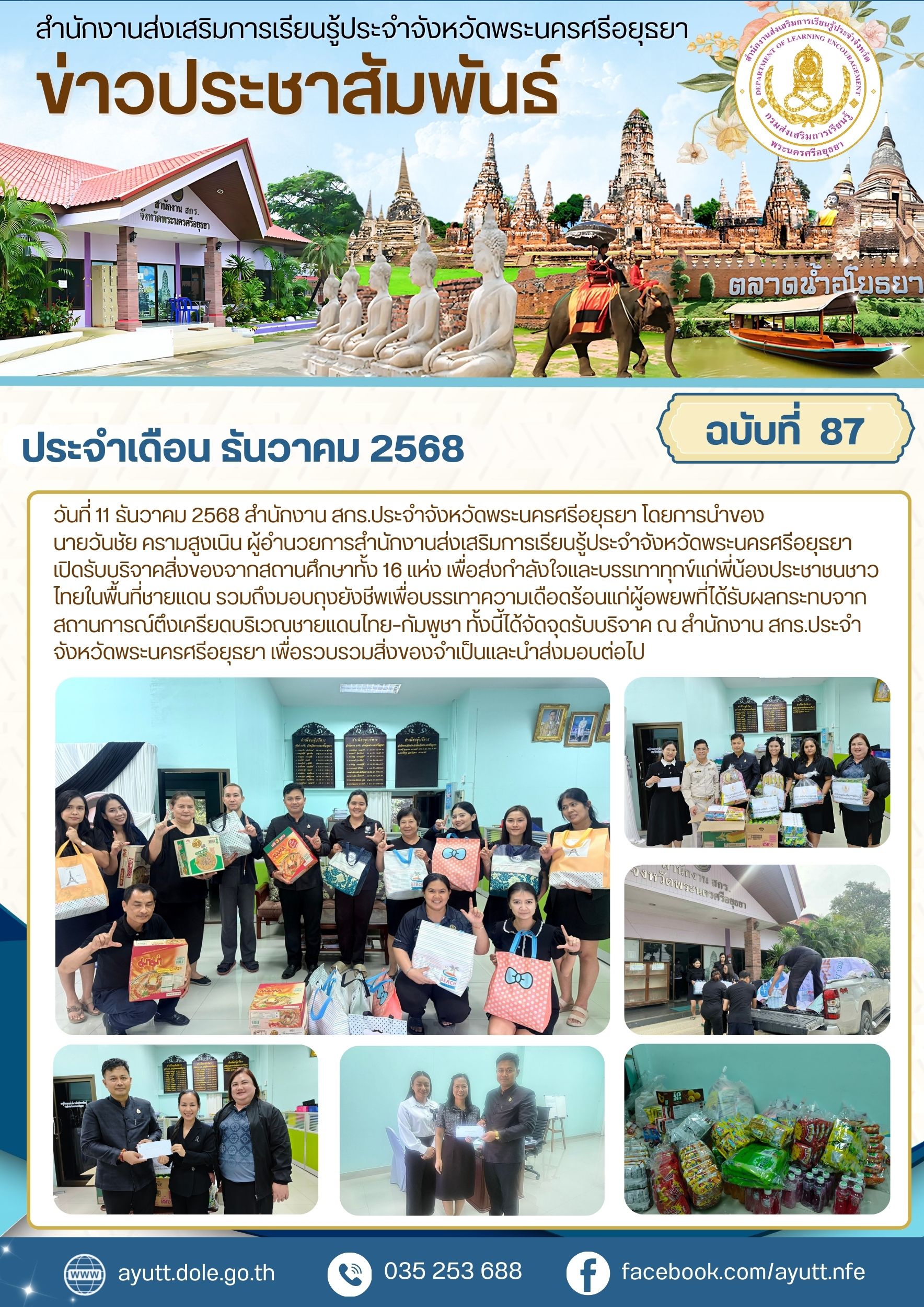 สำนักงาน สกร.ประจำจังหวัดพระนครศรีอยุธยา โดยการนำของนายวันชัย ครามสูงเนิน ผู้อำนวยการสำนักงานส่งเสริมการเรียนรู้ประจำจังหวัดพระนครศรีอยุธยา เปิดรับบริจาคสิ่งของจากสถานศึกษาทั้ง 16 แห่ง เพื่อส่งกำลังใจและบรรเทาทุกข์แก่พี่น้องประชาชนชาวไทยในพื้นที่ชายแดน รวมถึงมอบถุงยังชีพเพื่อบรรเทาความเดือดร้อนแก่ผู้อพยพที่ได้รับผลกระทบจากสถานการณ์ตึงเครียดบริเวณชายแดนไทย–กัมพูชา ทั้งนี้ได้จัดจุดรับบริจาค ณ สำนักงาน สกร.ประจำจังหวัดพระนครศรีอยุธยา เพื่อรวบรวมสิ่งของจำเป็นและนำส่งมอบต่อไป