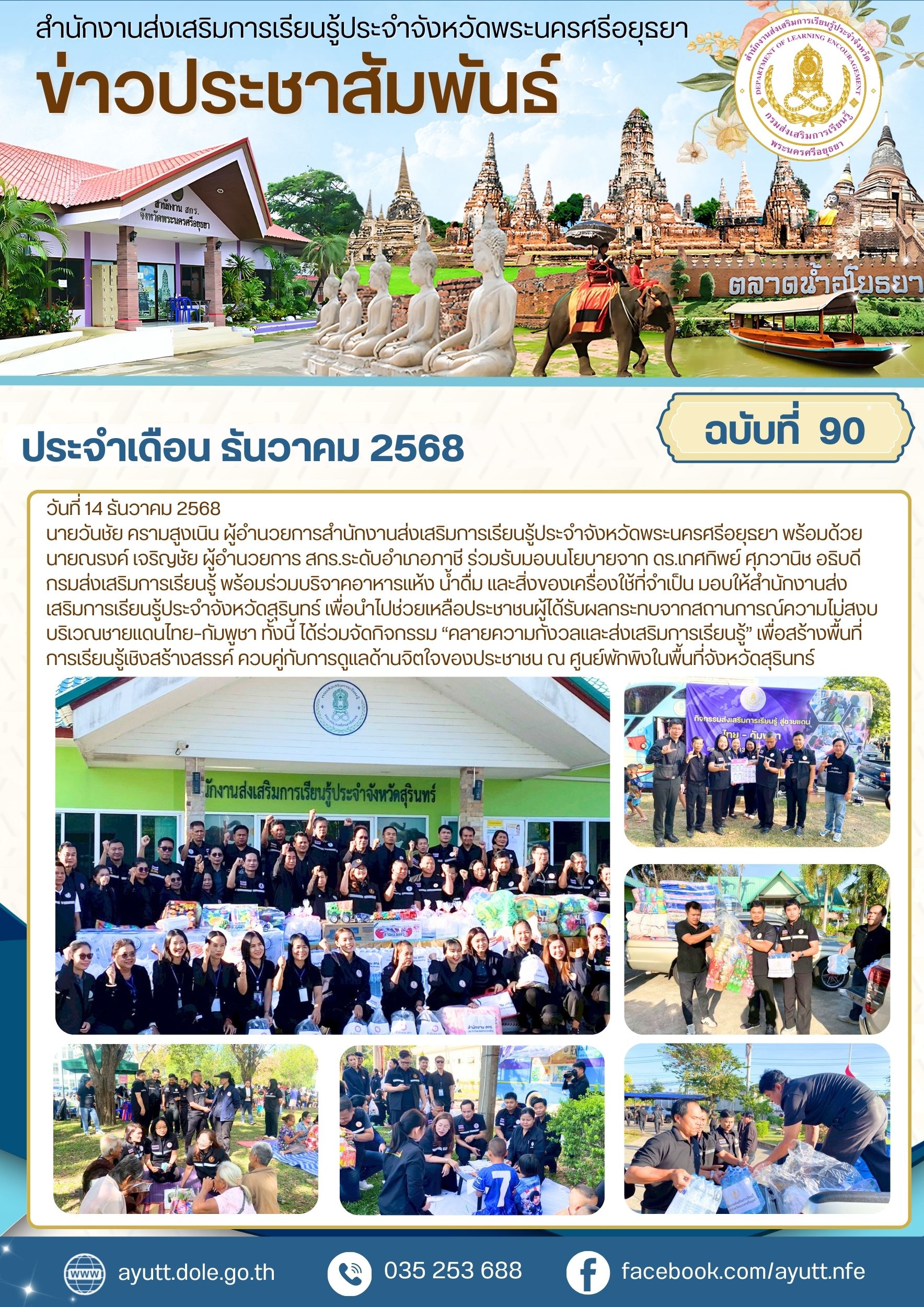 นายวันชัย ครามสูงเนิน ผู้อำนวยการสำนักงานส่งเสริมการเรียนรู้ประจำจังหวัดพระนครศรีอยุธยา พร้อมด้วยนายณรงค์ เจริญชัย ผู้อำนวยการ สกร.ระดับอำเภอภาชี ร่วมรับมอบนโยบายจาก ดร.เกศทิพย์ ศุภวานิช อธิบดีกรมส่งเสริมการเรียนรู้ พร้อมร่วมบริจาคอาหารแห้ง น้ำดื่ม และสิ่งของเครื่องใช้ที่จำเป็น มอบให้สำนักงานส่งเสริมการเรียนรู้ประจำจังหวัดสุรินทร์ เพื่อนำไปช่วยเหลือประชาชนผู้ได้รับผลกระทบจากสถานการณ์ความไม่สงบบริเวณชายแดนไทย–กัมพูชา ทั้งนี้ ได้ร่วมจัดกิจกรรม “คลายความกังวลและส่งเสริมการเรียนรู้” เพื่อสร้างพื้นที่การเรียนรู้เชิงสร้างสรรค์ ควบคู่กับการดูแลด้านจิตใจของประชาชน ณ ศูนย์พักพิงในพื้นที่จังหวัดสุรินทร์