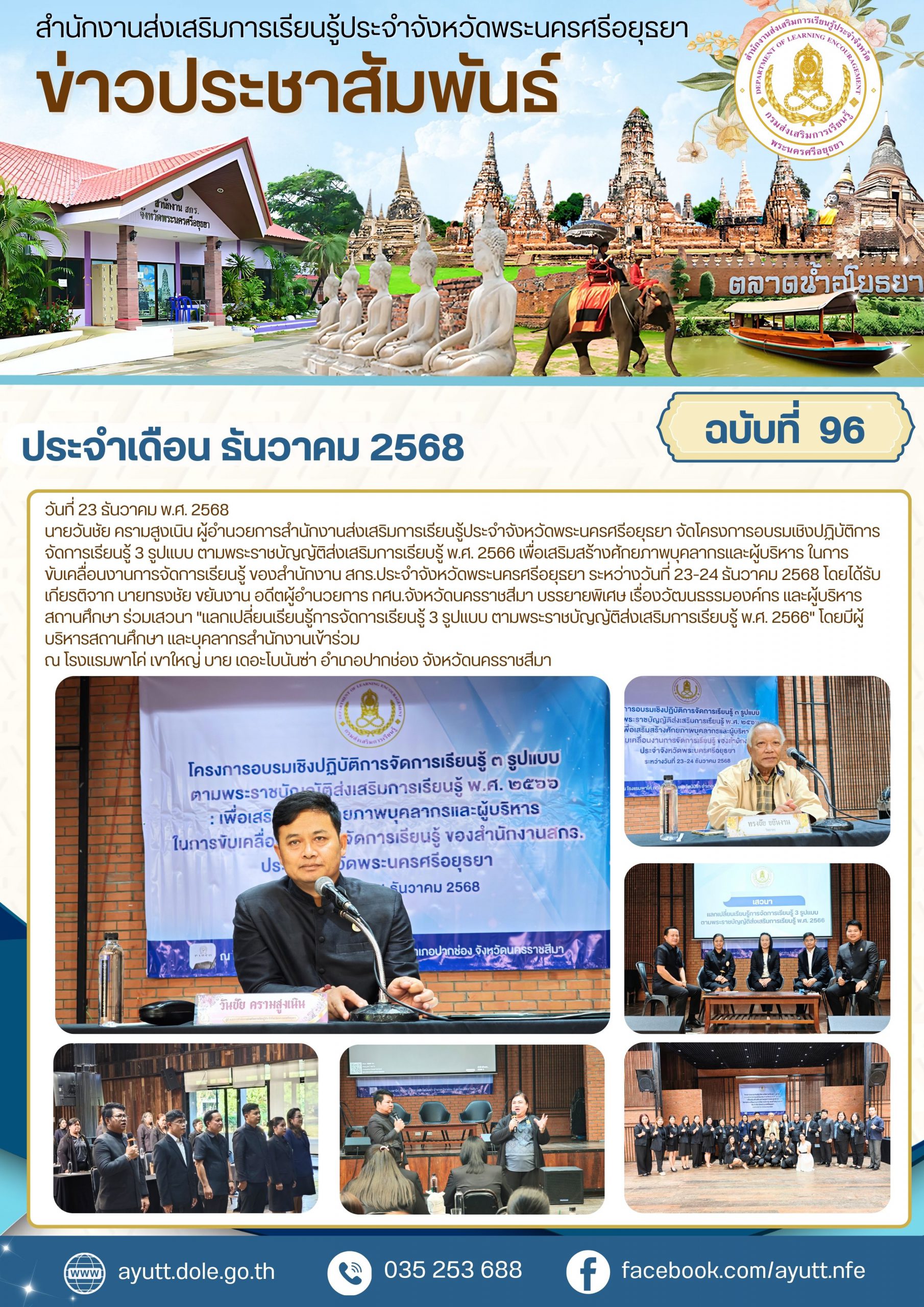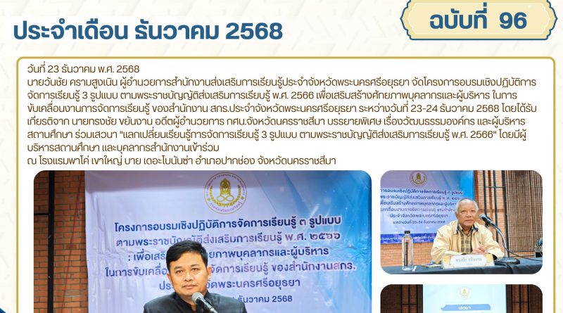 นายวันชัย ครามสูงเนิน ผู้อำนวยการสำนักงานส่งเสริมการเรียนรู้ประจำจังหวัดพระนครศรีอยุธยา จัดโครงการอบรมเชิงปฏิบัติการจัดการเรียนรู้ 3 รูปแบบ ตามพระราชบัญญัติส่งเสริมการเรียบรู้ พ.ศ. 2566 เพื่อเสริมสร้างศักยภาพบุคลากรและผู้บริหาร ในการขับเคลื่อนงานการจัดการเรียนรู้ ของสำนักงาน สกร.ประจำจังหวัดพระนครศรีอยุธยา ระหว่างวันที่ 23-24 ธันวาคม 2568 โดยได้รับเกียรติจาก นายทรงชัย ขยันงาน อดีตผู้อำนวยการ กศน.จังหวัดนครราชสีมา บรรยายพิเศษ เรื่องวัฒนธรรมองค์กร และผู้บริหารสถานศึกษา ร่วมเสวนา “แลกเปลี่ยนเรียนรู้การจัดการเรียนรู้ 3 รูปแบบ ตามพระราชบัญญัติส่งเสริมการเรียบรู้ พ.ศ. 2566” โดยมีผู้บริหารสถานศึกษา และบุคลากรสำนักงานเข้าร่วม