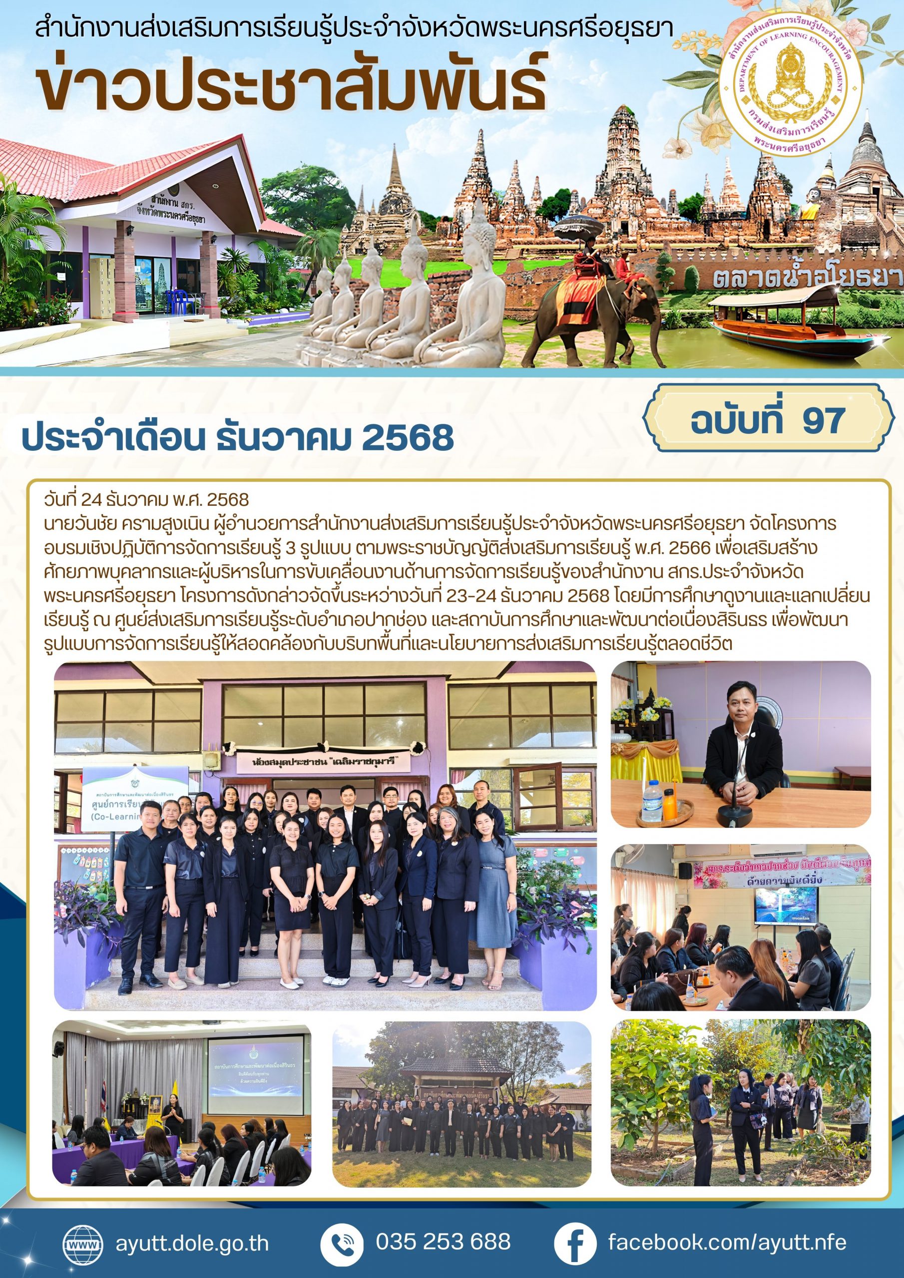 นายวันชัย ครามสูงเนิน ผู้อำนวยการสำนักงานส่งเสริมการเรียนรู้ประจำจังหวัดพระนครศรีอยุธยา จัดโครงการอบรมเชิงปฏิบัติการจัดการเรียนรู้ 3 รูปแบบ ตามพระราชบัญญัติส่งเสริมการเรียนรู้ พ.ศ. 2566 เพื่อเสริมสร้างศักยภาพบุคลากรและผู้บริหารในการขับเคลื่อนงานด้านการจัดการเรียนรู้ของสำนักงาน สกร.ประจำจังหวัดพระนครศรีอยุธยา โครงการดังกล่าวจัดขึ้นระหว่างวันที่ 23–24 ธันวาคม 2568 โดยมีการศึกษาดูงานและแลกเปลี่ยนเรียนรู้ ณ ศูนย์ส่งเสริมการเรียนรู้ระดับอำเภอปากช่อง และสถาบันการศึกษาและพัฒนาต่อเนื่องสิรินธร เพื่อพัฒนา รูปแบบการจัดการเรียนรู้ให้สอดคล้องกับบริบทพื้นที่และนโยบายการส่งเสริมการเรียนรู้ตลอดชีวิต