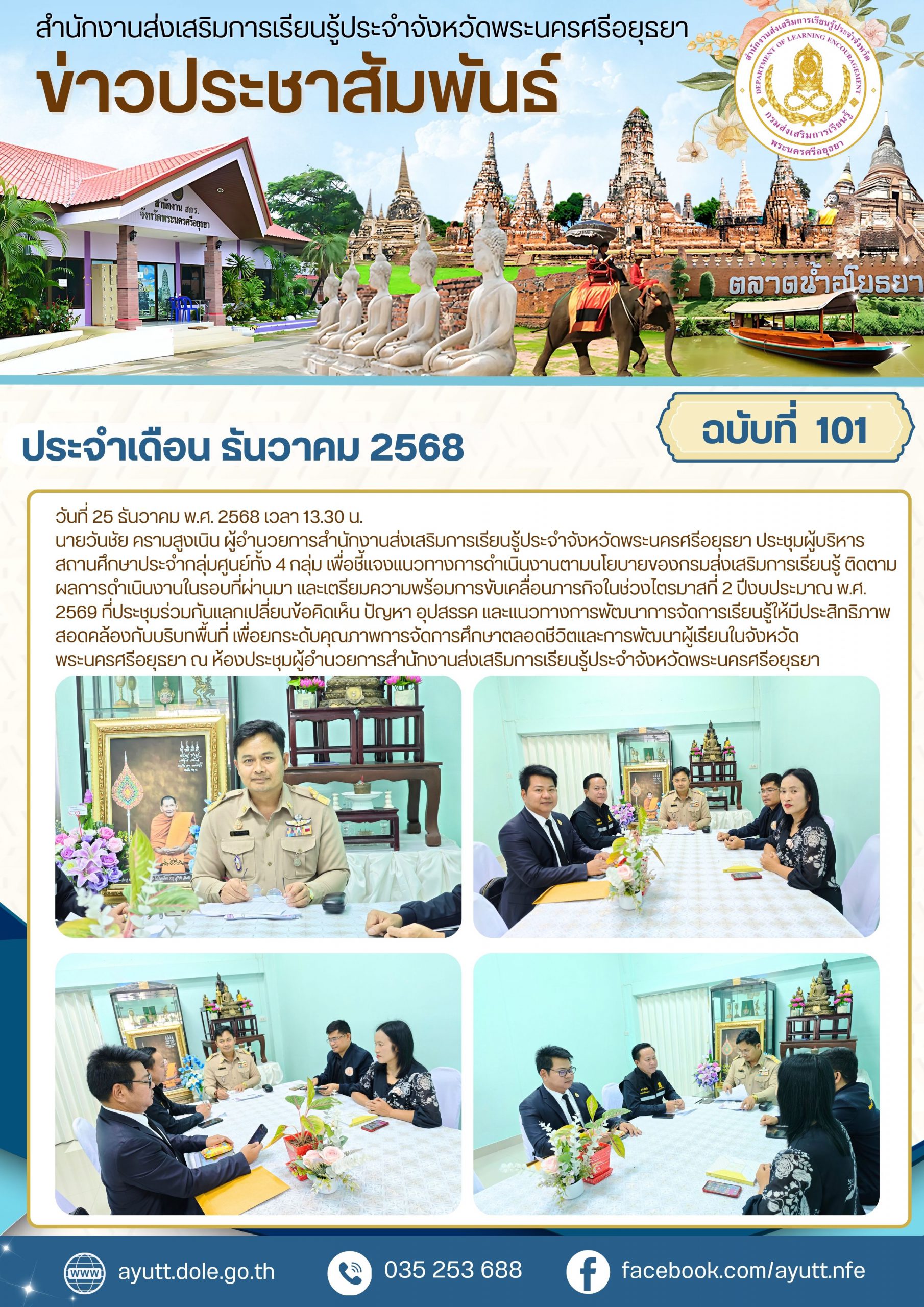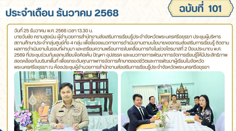 นายวันชัย ครามสูงเนิน ผู้อำนวยการสำนักงานส่งเสริมการเรียนรู้ประจำจังหวัดพระนครศรีอยุธยา ประชุมผู้บริหารสถานศึกษาประจำกลุ่มศูนย์ทั้ง 4 กลุ่ม เพื่อชี้แจงแนวทางการดำเนินงานตามนโยบายของกรมส่งเสริมการเรียนรู้ ติดตามผลการดำเนินงานในรอบที่ผ่านมา และเตรียมความพร้อมการขับเคลื่อนภารกิจในช่วงไตรมาสที่ 2 ปีงบประมาณ พ.ศ. 2569 ที่ประชุมร่วมกันแลกเปลี่ยนข้อคิดเห็น ปัญหา อุปสรรค และแนวทางการพัฒนาการจัดการเรียนรู้ให้มีประสิทธิภาพ สอดคล้องกับบริบทพื้นที่ เพื่อยกระดับคุณภาพการจัดการศึกษาตลอดชีวิตและการพัฒนาผู้เรียนในจังหวัดพระนครศรีอยุธยา ณ ห้องประชุมผู้อำนวยการสำนักงานส่งเสริมการเรียนรู้ประจำจังหวัดพระนครศรีอยุธยา