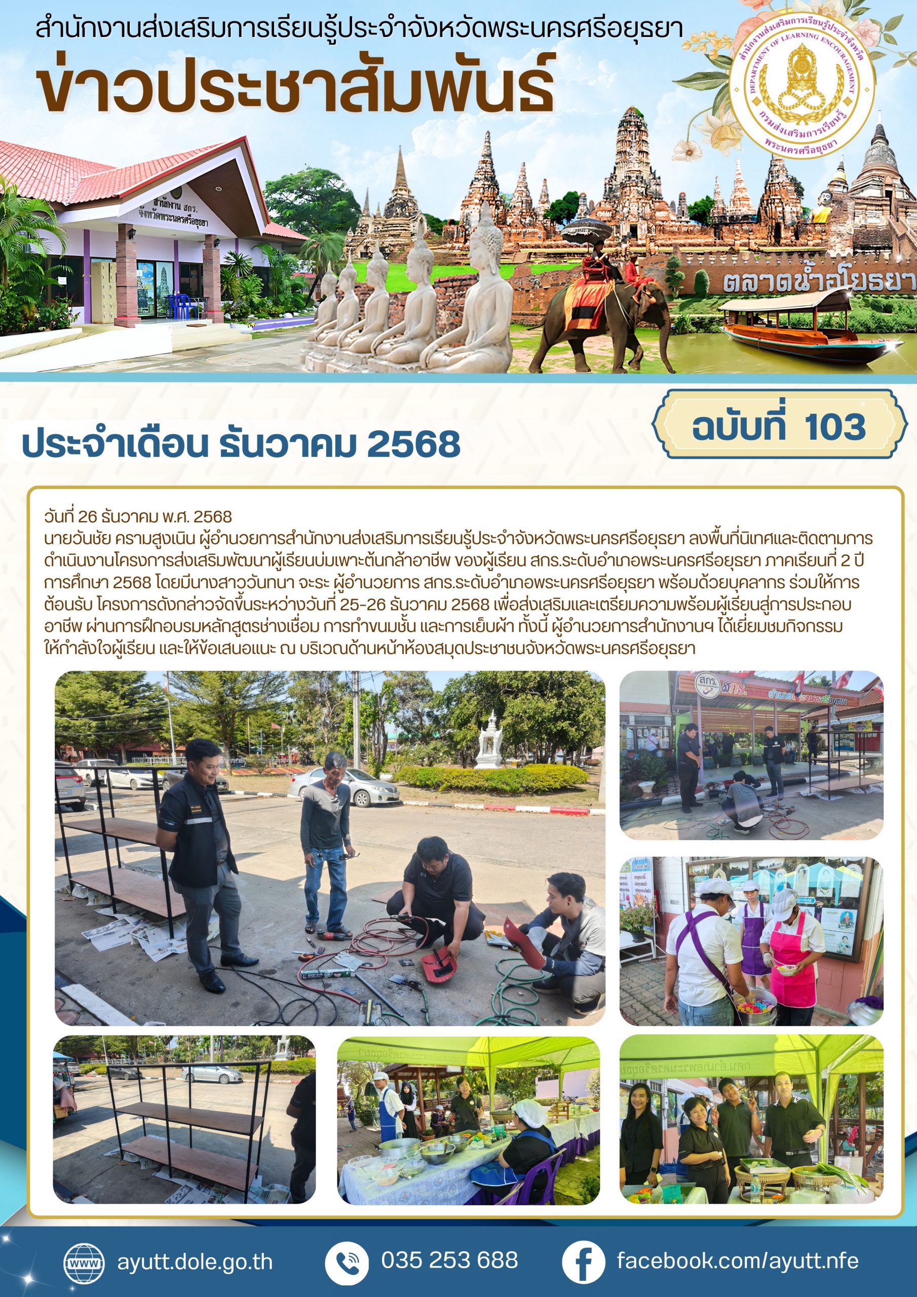 นายวันชัย ครามสูงเนิน ผู้อำนวยการสำนักงานส่งเสริมการเรียนรู้ประจำจังหวัดพระนครศรีอยุธยา ลงพื้นที่นิเทศและติดตามการดำเนินงานโครงการส่งเสริมพัฒนาผู้เรียนบ่มเพาะต้นกล้าอาชีพ ของผู้เรียน สกร.ระดับอำเภอพระนครศรีอยุธยา ภาคเรียนที่ 2 ปีการศึกษา 2568 โดยมีนางสาววันทนา จะระ ผู้อำนวยการ สกร.ระดับอำเภอพระนครศรีอยุธยา พร้อมด้วยบุคลากร ร่วมให้การต้อนรับ โครงการดังกล่าวจัดขึ้นระหว่างวันที่ 25–26 ธันวาคม 2568 เพื่อส่งเสริมและเตรียมความพร้อมผู้เรียนสู่การประกอบอาชีพ ผ่านการฝึกอบรมหลักสูตรช่างเชื่อม การทำขนมชั้น และการเย็บผ้า ทั้งนี้ ผู้อำนวยการสำนักงานฯ ได้เยี่ยมชมกิจกรรม