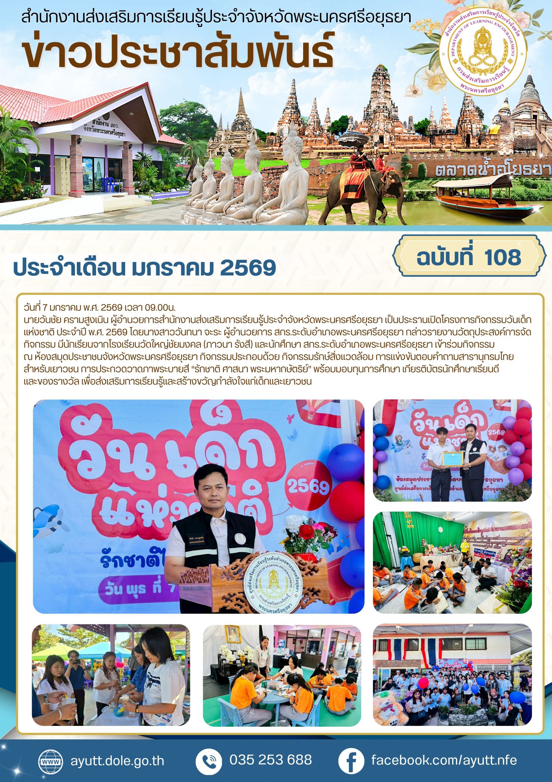 นายวันชัย ครามสูงเนิน ผู้อำนวยการสำนักงานส่งเสริมการเรียนรู้ประจำจังหวัดพระนครศรีอยุธยา เป็นประธานเปิดโครงการกิจกรรมวันเด็กแห่งชาติ ประจำปี พ.ศ. 2569 โดยนางสาววันทนา จะระ ผู้อำนวยการ สกร.ระดับอำเภอพระนครศรีอยุธยา กล่าวรายงานวัตถุประสงค์การจัดกิจกรรม
