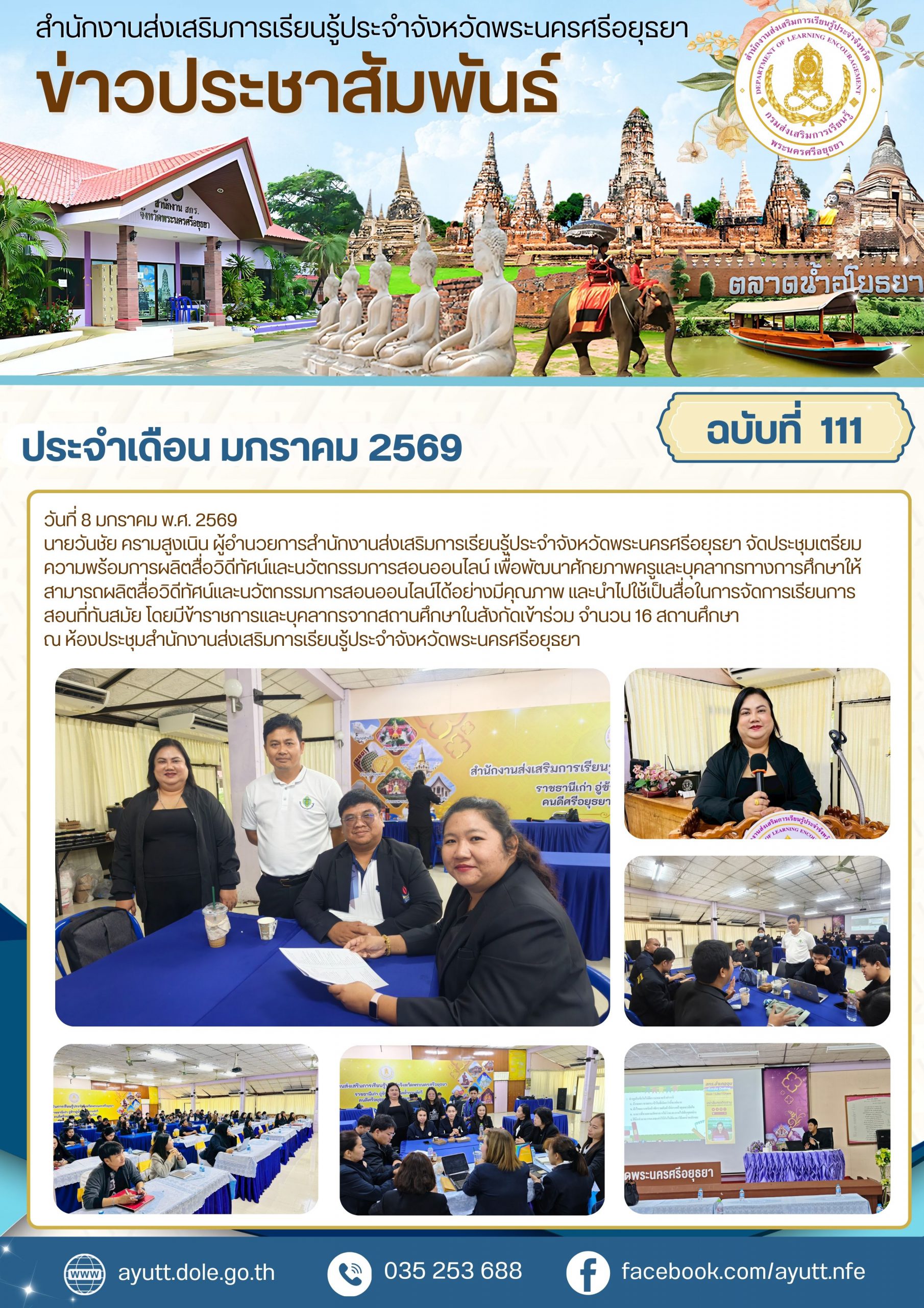 นายวันชัย ครามสูงเนิน ผู้อำนวยการสำนักงานส่งเสริมการเรียนรู้ประจำจังหวัดพระนครศรีอยุธยา จัดประชุมเตรียมความพร้อมการผลิตสื่อวิดีทัศน์และนวัตกรรมการสอนออนไลน์ เพื่อพัฒนาศักยภาพครูและบุคลากรทางการศึกษาให้สามารถผลิตสื่อวิดีทัศน์และนวัตกรรมการสอนออนไลน์ได้อย่างมีคุณภาพ และนำไปใช้เป็นสื่อในการจัดการเรียนการสอนที่ทันสมัย โดยมีข้าราชการและบุคลากรจากสถานศึกษาในสังกัดเข้าร่วม จำนวน 16 สถานศึกษา