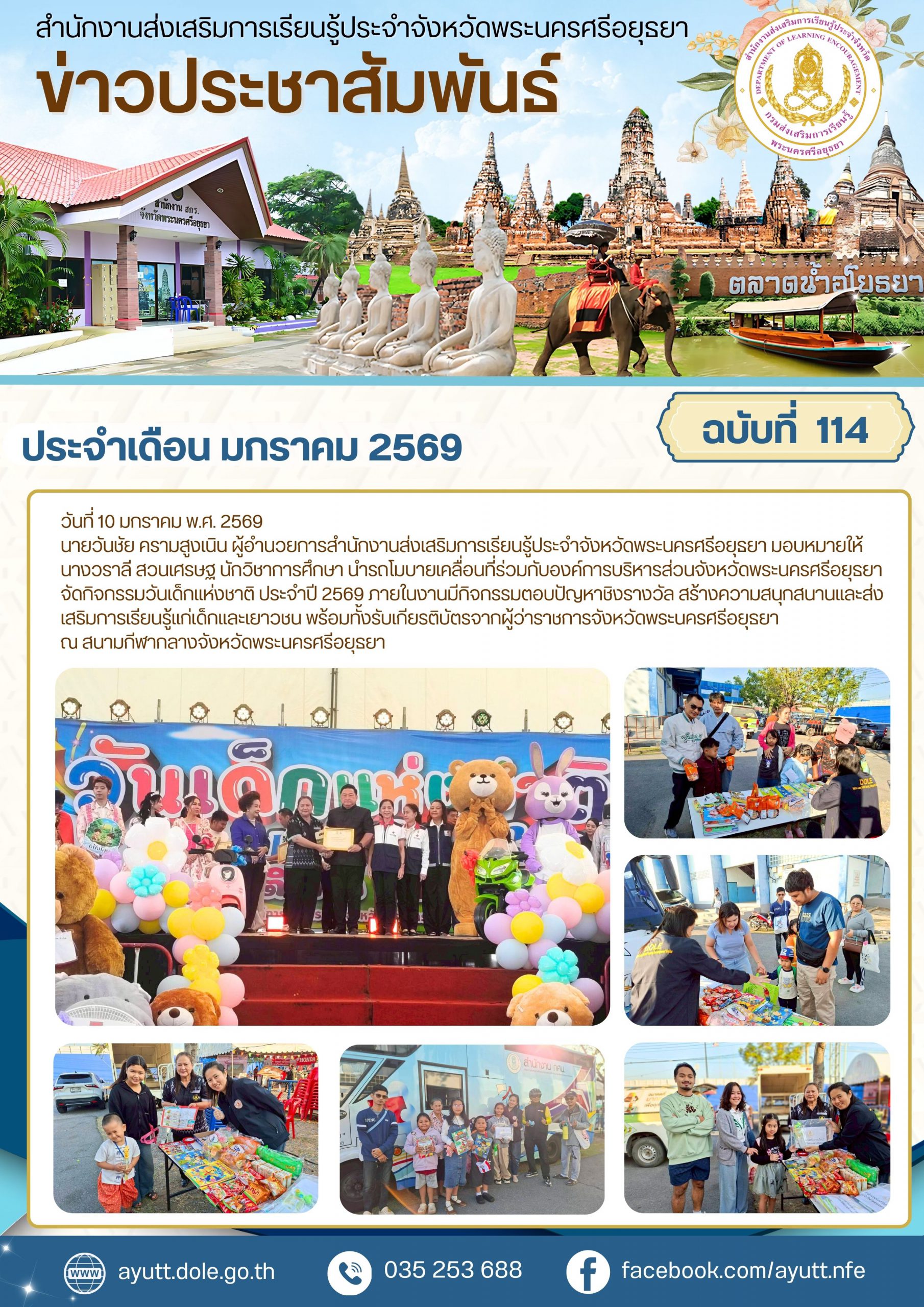 นายวันชัย ครามสูงเนิน ผู้อำนวยการสำนักงานส่งเสริมการเรียนรู้ประจำจังหวัดพระนครศรีอยุธยา มอบหมายให้ นางวราลี สวนเศรษฐ นักวิชาการศึกษา นำรถโมบายเคลื่อนที่ร่วมกับองค์การบริหารส่วนจังหวัดพระนครศรีอยุธยา จัดกิจกรรมวันเด็กแห่งชาติ ประจำปี 2569 ภายในงานมีกิจกรรมตอบปัญหาชิงรางวัล สร้างความสนุกสนานและส่งเสริมการเรียนรู้แก่เด็กและเยาวชน พร้อมทั้งรับเกียรติบัตรจากผู้ว่าราชการจังหวัดพระนครศรีอยุธยา