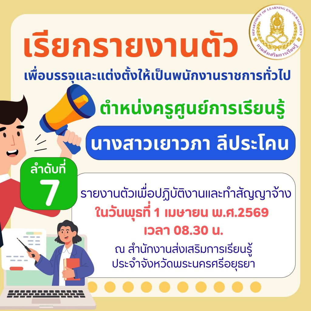 เรียกรายงานตัวเพื่อเข้ารับการบรรจุและแต่งตั้งเป็นพนักงานราชการทั่วไป ตำแหน่ง ครูศูนย์การเรียนรู้ ลำดับที่ 7