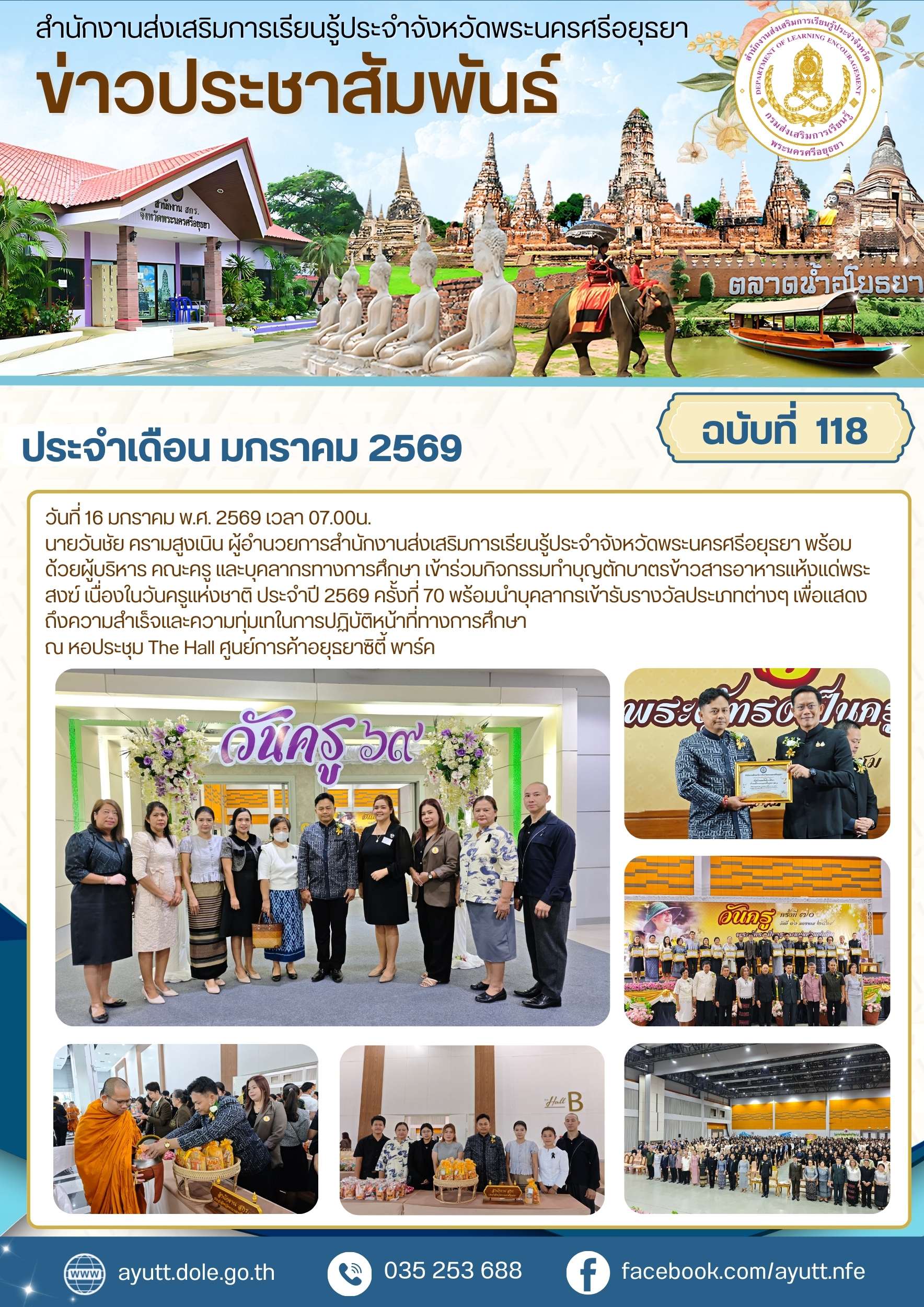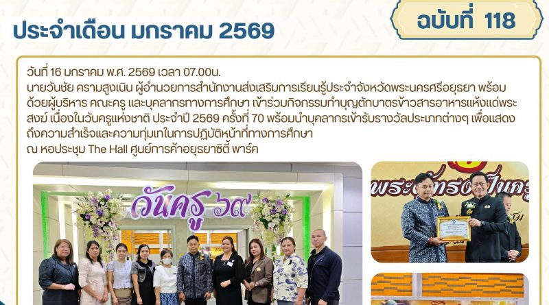 นายวันชัย ครามสูงเนิน ผู้อำนวยการสำนักงานส่งเสริมการเรียนรู้ประจำจังหวัดพระนครศรีอยุธยา พร้อมด้วยผู้บริหาร คณะครู และบุคลากรทางการศึกษา เข้าร่วมกิจกรรมทำบุญตักบาตรข้าวสารอาหารแห้งแด่พระสงฆ์ เนื่องในวันครูแห่งชาติ ประจำปี 2569 ครั้งที่ 70 พร้อมนำบุคลากรเข้ารับรางวัลประเภทต่างๆ เพื่อแสดงถึงความสำเร็จและความทุ่มเทในการปฏิบัติหน้าที่ทางการศึกษา