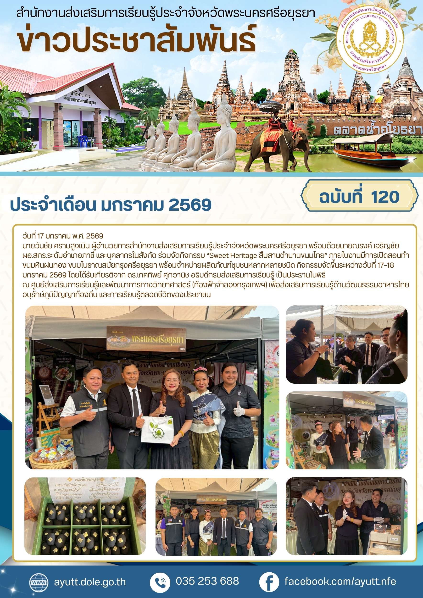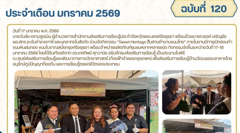 นายวันชัย ครามสูงเนิน ผู้อำนวยการสำนักงานส่งเสริมการเรียนรู้ประจำจังหวัดพระนครศรีอยุธยา พร้อมด้วย นายณรงค์ เจริญชัย ผู้อำนวยการ สกร.ระดับอำเภอภาชี และบุคลากรในสังกัด ร่วมจัดกิจกรรม “Sweet Heritage สืบสานตำนานขนมไทย” โดยสำนักงานส่งเสริมการเรียนรู้ประจำจังหวัดพระนครศรีอยุธยา ได้จัดกิจกรรมเปิดสอนการทำ ขนมหินฝนทอง ขนมโบราณที่เคยแพร่หลายในสมัยกรุงศรีอยุธยา ซึ่งปัจจุบันแทบสูญหายไปจากวิถีชีวิตของคนไทย