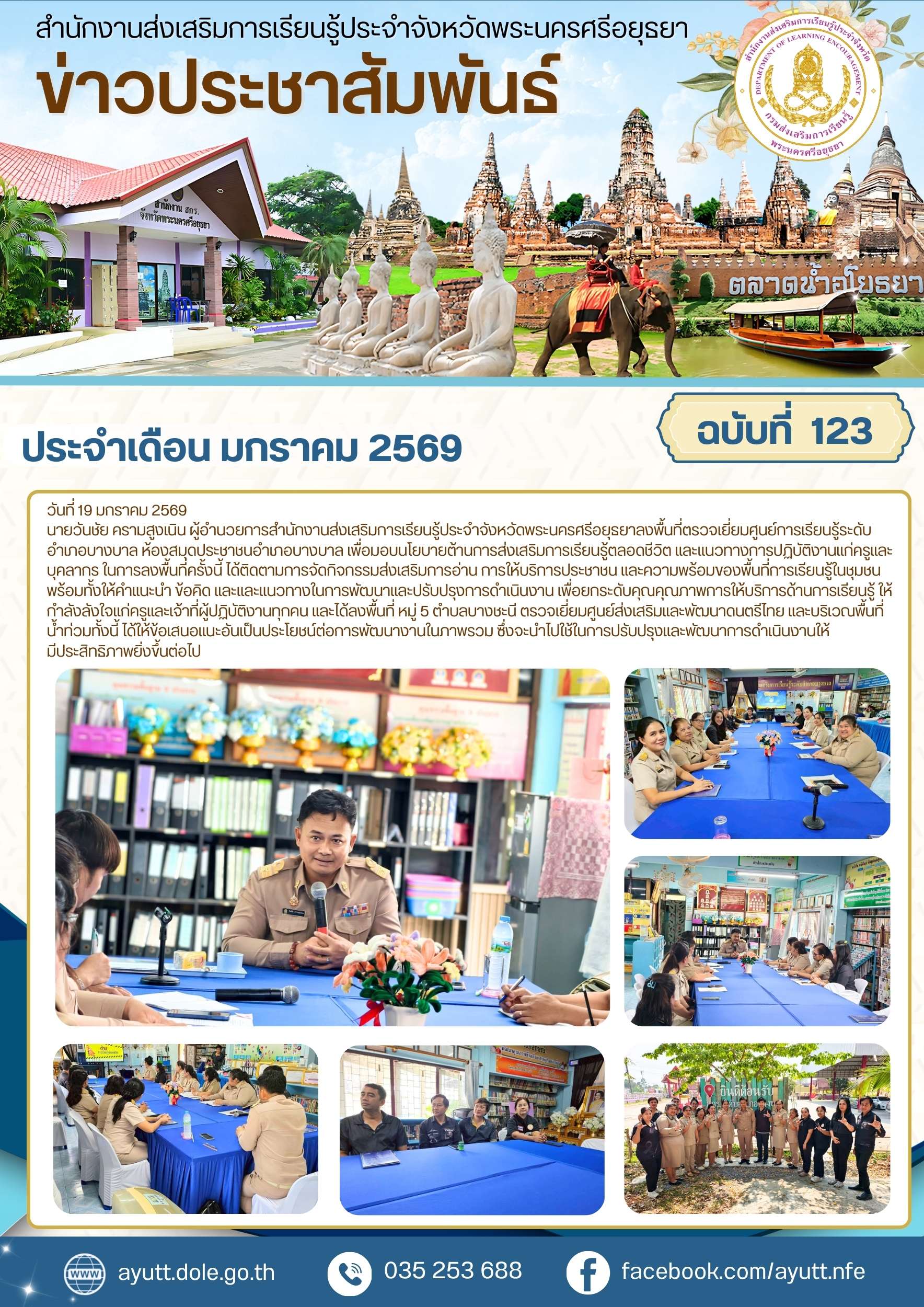 นายวันชัย ครามสูงเนิน ผู้อำนวยการสำนักงานส่งเสริมการเรียนรู้ประจำจังหวัดพระนครศรีอยุธยาลงพื้นที่ตรวจเยี่ยมศูนย์การเรียนรู้ระดับอำเภอบางบาล ห้องสมุดประชาชนอำเภอบางบาล เพื่อมอบนโยบายต้านการส่งเสริมการเรียนรู้ตลอดชีวิต และแนวทางการปฏิบัติงานแก่ครูและบุคลากร ในการลงพื้นที่ครั้งนี้ ได้ติดตามการจัดกิจกรรมส่งเสริมการอ่าน การให้บริการประชาชน และความพร้อมของพื้นที่การเรียนรู้ในชุมชน พร้อมทั้งให้คำแนะนำ ข้อคิด และและแนวทางในการพัฒนาและปรับปรุงการดำเนินงาน เพื่อยกระดับคุณคุณภาพการให้บริการด้านการเรียนรู้ ให้กำลังลังใจแก่ครูและเจ้าที่ผู้ปฏิบัติงานทุกคน และได้ลงพื้นที่ หมู่ 5 ตำบลบางชะนี ตรวจเยี่ยมศูนย์ส่งเสริมและพัฒนาดนตรีไทย และบริเวณพื้นที่น้ำท่วมทั้งนี้ ได้ให้ข้อเสนอแนะอันเป็นประโยชน์ต่อการพัฒนางานในภาพรวม ซึ่งจะนำไปใช้ในการปรับปรุงและพัฒนาการดำเนินงานให้