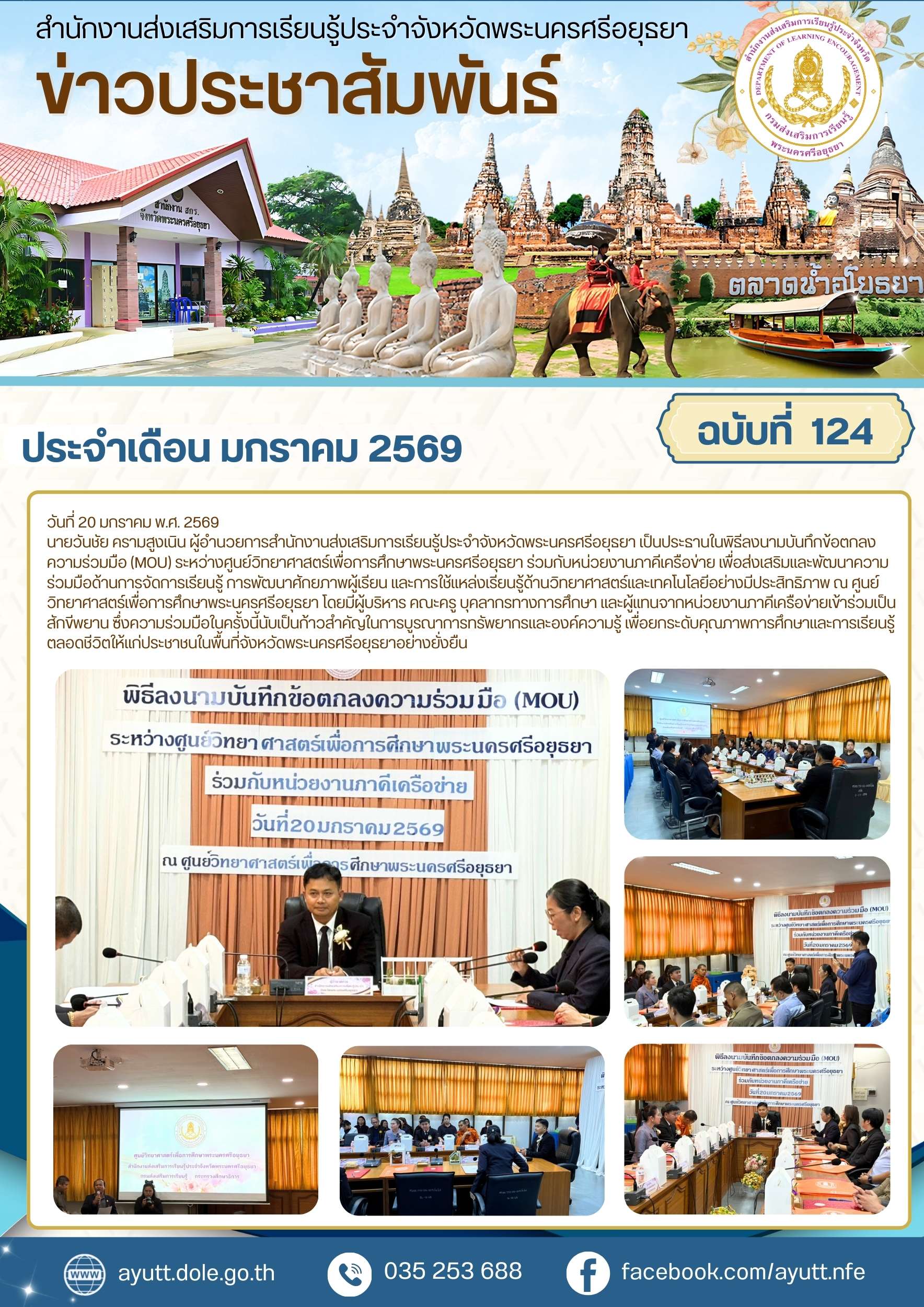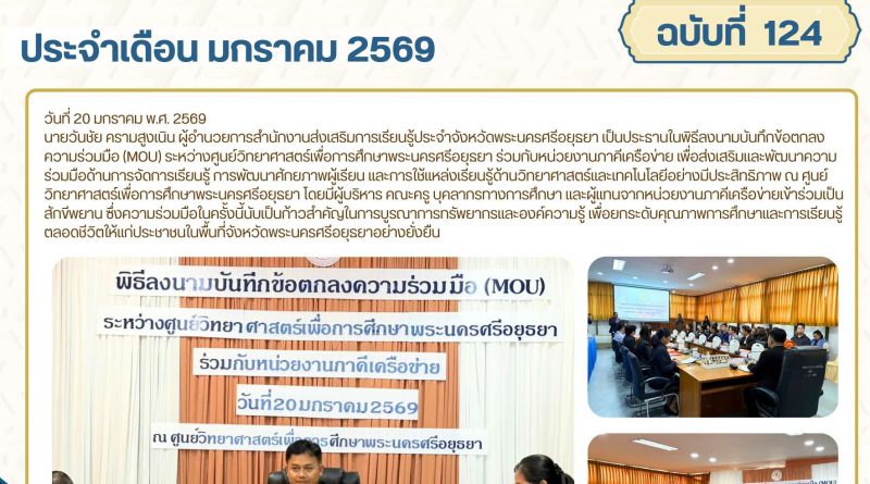 นายวันชัย ครามสูงเนิน ผู้อำนวยการสำนักงานส่งเสริมการเรียนรู้ประจำจังหวัดพระนครศรีอยุธยา เป็นประธานในพิธีลงนามบันทึกข้อตกลงความร่วมมือ (MOU) ระหว่างศูนย์วิทยาศาสตร์เพื่อการศึกษาพระนครศรีอยุธยา ร่วมกับหน่วยงานภาคีเครือข่าย เพื่อส่งเสริมและพัฒนาความร่วมมือด้านการจัดการเรียนรู้ การพัฒนาศักยภาพผู้เรียน และการใช้แหล่งเรียนรู้ด้านวิทยาศาสตร์และเทคโนโลยีอย่างมีประสิทธิภาพ ณ ศูนย์วิทยาศาสตร์เพื่อการศึกษาพระนครศรีอยุธยา โดยมีผู้บริหาร คณะครู บุคลากรทางการศึกษา และผู้แทนจากหน่วยงานภาคีเครือข่ายเข้าร่วมเป็นสักขีพยาน ซึ่งความร่วมมือในครั้งนี้นับเป็นก้าวสำคัญในการบูรณาการทรัพยากรและองค์ความรู้ เพื่อยกระดับคุณภาพการศึกษาและการเรียนรู้ตลอดชีวิตให้แก่ประชาชนในพื้นที่จังหวัดพระนครศรีอยุธยาอย่างยั่งยืน
