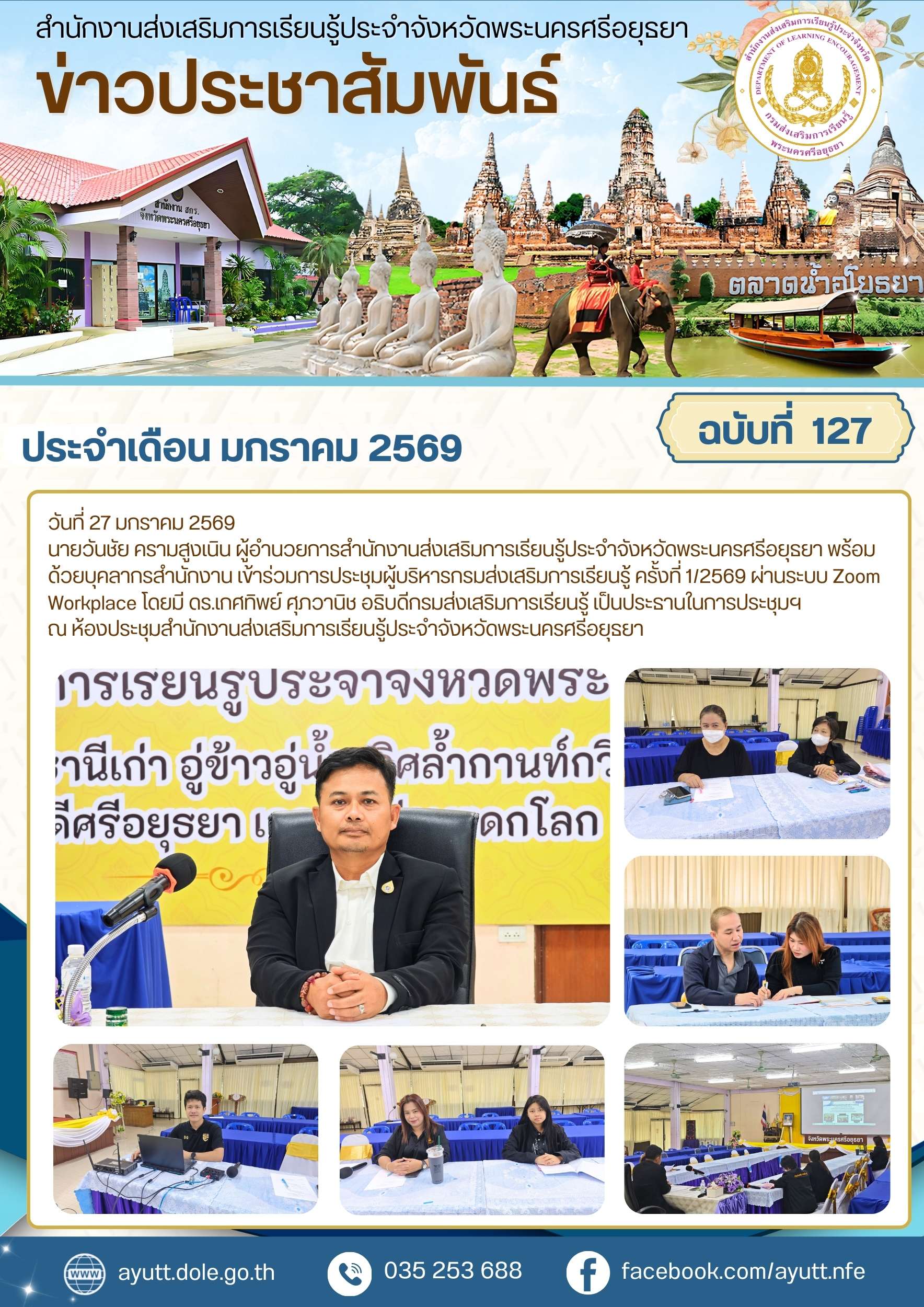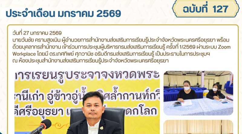 นายวันชัย ครามสูงเนิน ผู้อำนวยการสำนักงานส่งเสริมการเรียนรู้ประจำจังหวัดพระนครศรีอยุธยา พร้อมด้วยบุคลากรสำนักงาน เข้าร่วมการประชุมผู้บริหารกรมส่งเสริมการเรียนรู้ ครั้งที่ 1/2569 ผ่านระบบ Zoom Workplace โดยมี ดร.เกศทิพย์ ศุภวานิช อธิบดีกรมส่งเสริมการเรียนรู้ เป็นประธานในการประชุมฯ