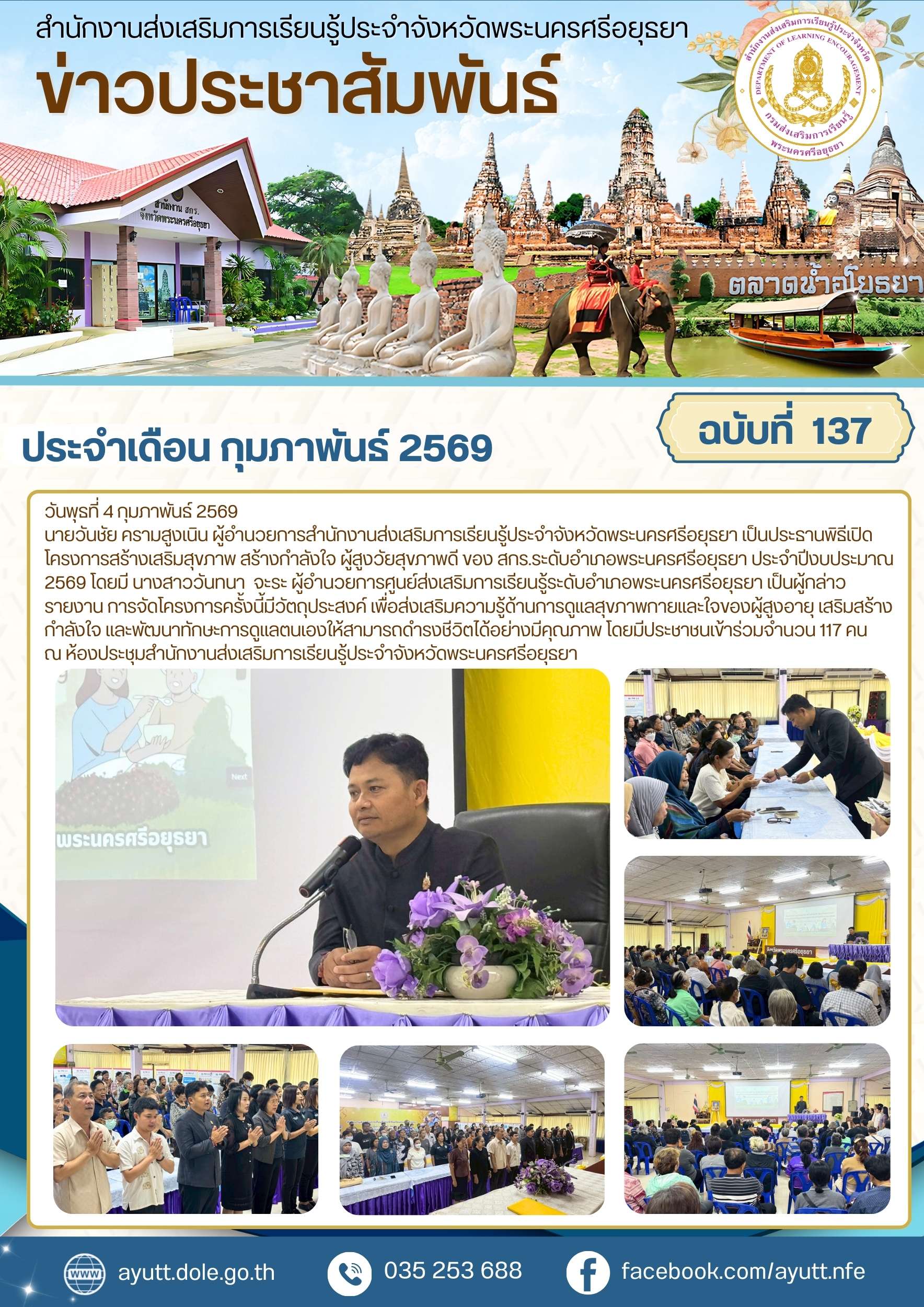 นายวันชัย ครามสูงเนิน ผู้อำนวยการสำนักงานส่งเสริมการเรียนรู้ประจำจังหวัดพระนครศรีอยุธยา เป็นประธานพิธีเปิดโครงการสร้างเสริมสุขภาพ สร้างกำลังใจ ผู้สูงวัยสุขภาพดี ของ สกร.ระดับอำเภอพระนครศรีอยุธยา ประจำปีงบประมาณ 2569 โดยมี นางสาววันทนา จะระ ผู้อำนวยการศูนย์ส่งเสริมการเรียนรู้ระดับอำเภอ พระนครศรีอยุธยา เป็นผู้กล่าวรายงาน