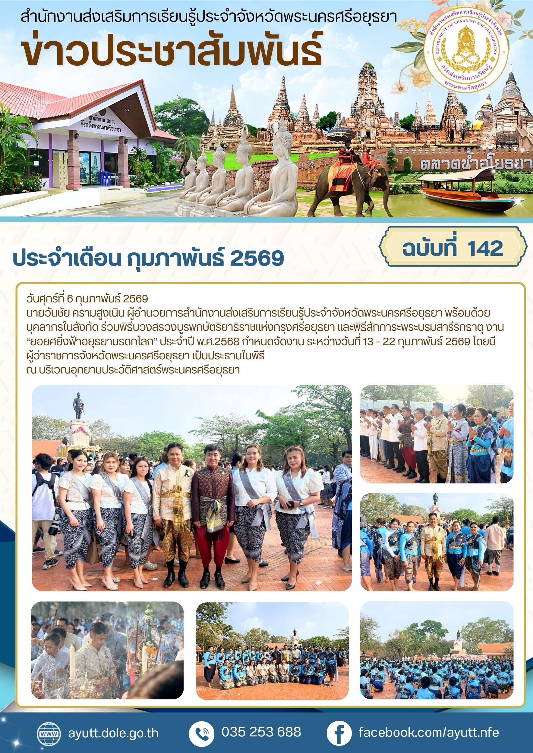 นายวันชัย ครามสูงเนิน ผู้อำนวยการสำนักงานส่งเสริมการเรียนรู้ประจำจังหวัดพระนครศรีอยุธยา พร้อมด้วยบุคลากรในสังกัด ร่วมพิธีบวงสรวงบูรพกษัตริยาธิราชแห่งกรุงศรีอยุธยา และพิธีสักการะพระบรมสารีริกธาตุ งาน “ยอยศยิ่งฟ้าอยุธยามรดกโลก” ประจำปี พ.ศ.2568 กำหนดจัดงาน ระหว่างวันที่ 13 – 22 กุมภาพันธ์ 2569 โดยมี ผู้ว่าราชการจังหวัดพระนครศรีอยุธยา เป็นประธานในพิธี