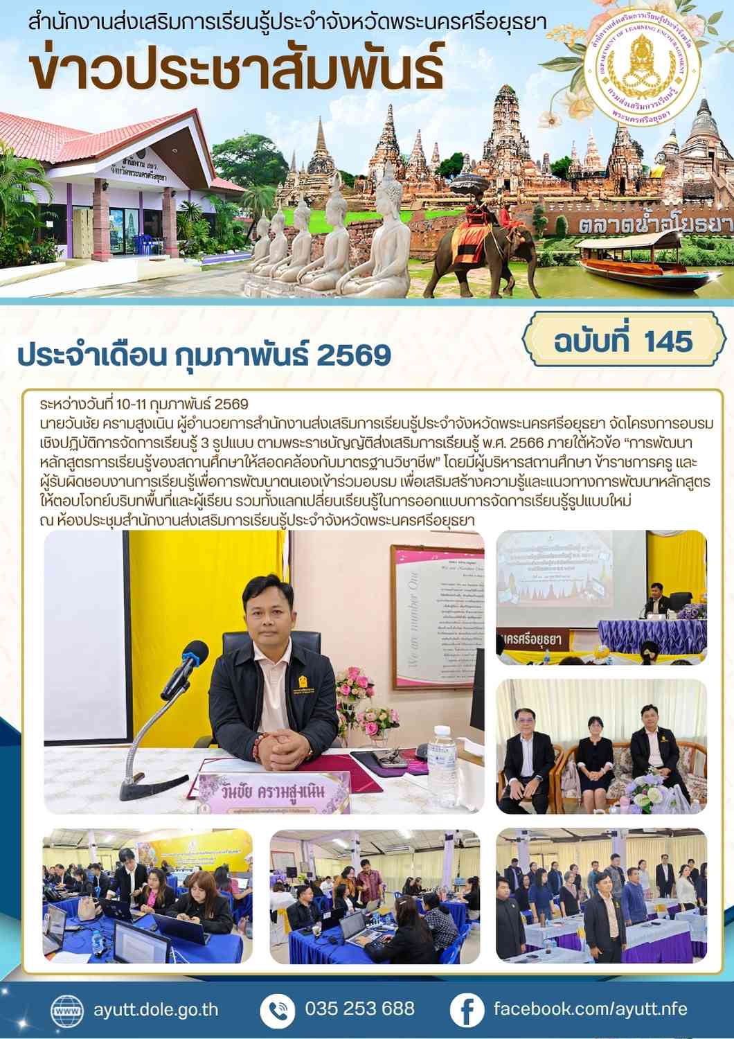 นายวันชัย ครามสูงเนิน ผู้อำนวยการสำนักงานส่งเสริมการเรียนรู้ประจำจังหวัดพระนครศรีอยุธยา จัดโครงการอบรมเชิงปฏิบัติการจัดการเรียนรู้ 3 รูปแบบ ตามพระราชบัญญัติส่งเสริมการเรียนรู้ พ.ศ. 2566 ภายใต้หัวข้อ “การพัฒนาหลักสูตรการเรียนรู้ของสถานศึกษาให้สอดคล้องกับมาตรฐานวิชาชีพ” โดยมีผู้บริหารสถานศึกษา ข้าราชการครู และผู้รับผิดชอบงานการเรียนรู้เพื่อการพัฒนาตนเองเข้าร่วมอบรม เพื่อเสริมสร้างความรู้และแนวทางการพัฒนาหลักสูตรให้ตอบโจทย์บริบทพื้นที่และผู้เรียน รวมทั้งแลกเปลี่ยนเรียนรู้ในการออกแบบการจัดการเรียนรู้รูปแบบใหม่