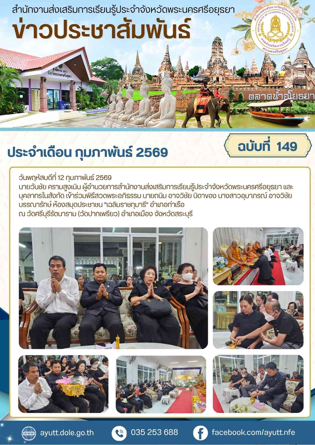 นายวันชัย ครามสูงเนิน ผู้อำนวยการสำนักงานส่งเสริมการเรียนรู้ประจำจังหวัดพระนครศรีอยุธยา และบุคลากรในสังกัด เข้าร่วมพิธีสวดพระอภิธรรม นายถนิม อาจวิชัย บิดาของ นางสาวอุมาภรณ์ อาจวิชัยบรรณารักษ์ ห้องสมุดประชาชน “เฉลิมราชกุมารี” อำเภอท่าเรือ