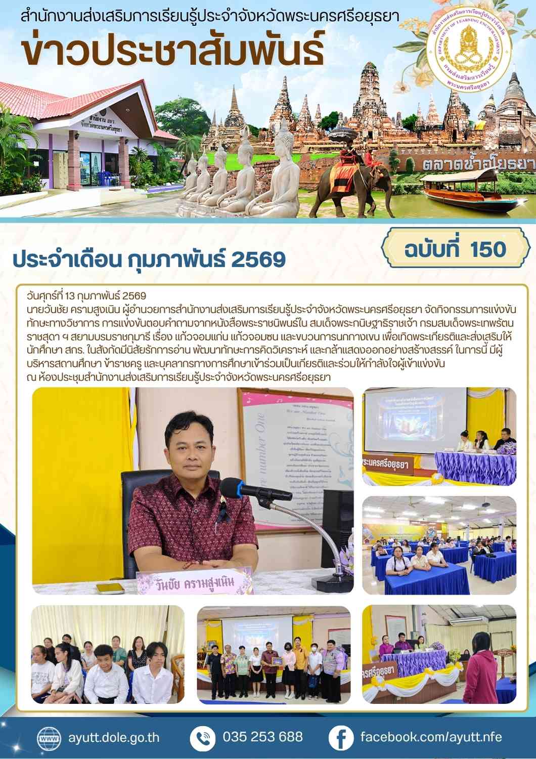 นายวันชัย ครามสูงเนิน ผู้อำนวยการสำนักงานส่งเสริมการเรียนรู้ประจำจังหวัดพระนครศรีอยุธยา จัดกิจกรรมการแข่งขันทักษะทางวิชาการ การแข่งขันตอบคำถามจากหนังสือพระราชนิพนธ์ใน สมเด็จพระกนิษฐาธิราชเจ้า กรมสมเด็จพระเทพรัตนราชสุดา ฯ สยามบรมราชกุมารี เรื่อง แก้วจอมแก่น แก้วจอมซน และขบวนการนกกางเขน เพื่อเทิดพระเกียรติและส่งเสริมให้นักศึกษา สกร. ในสังกัดมีนิสัยรักการอ่าน พัฒนาทักษะการคิดวิเคราะห์ และกล้าแสดงออกอย่างสร้างสรรค์ ในการนี้ มีผู้บริหารสถานศึกษา ข้าราชครู และบุคลากรทางการศึกษาเข้าร่วมเป็นเกียรติและร่วมให้กำลังใจผู้เข้าแข่งขัน