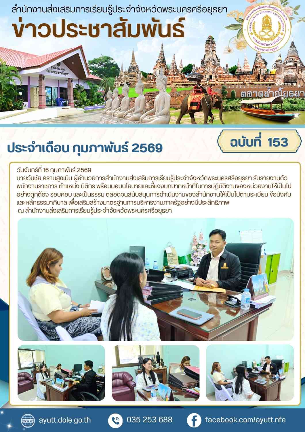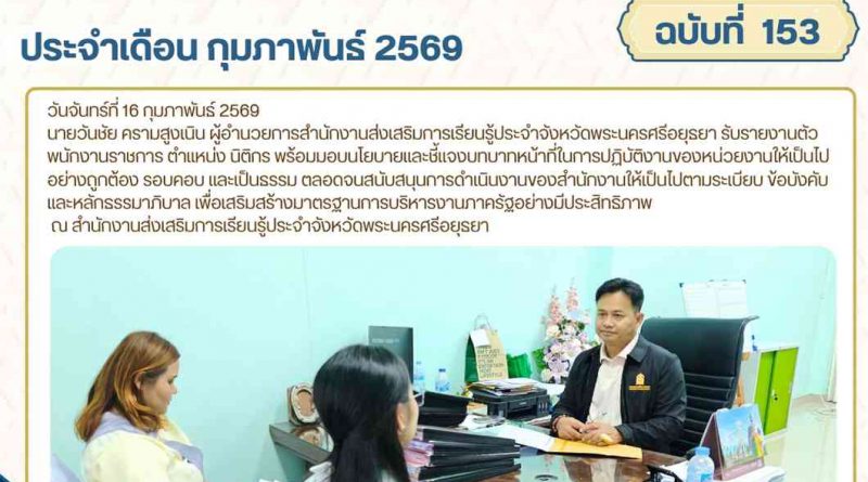 นายวันชัย ครามสูงเนิน ผู้อำนวยการสำนักงานส่งเสริมการเรียนรู้ประจำจังหวัดพระนครศรีอยุธยา รับรายงานตัวพนักงานราชการ ตำแหน่ง นิติกร พร้อมมอบนโยบายและชี้แจงบทบาทหน้าที่ในการปฏิบัติงานของหน่วยงานให้เป็นไปอย่างถูกต้อง รอบคอบ และเป็นธรรม ตลอดจนสนับสนุนการดำเนินงานของสำนักงานให้เป็นไปตามระเบียบ ข้อบังคับ และหลักธรรมาภิบาล เพื่อเสริมสร้างมาตรฐานการบริหารงานภาครัฐอย่างมีประสิทธิภาพ
