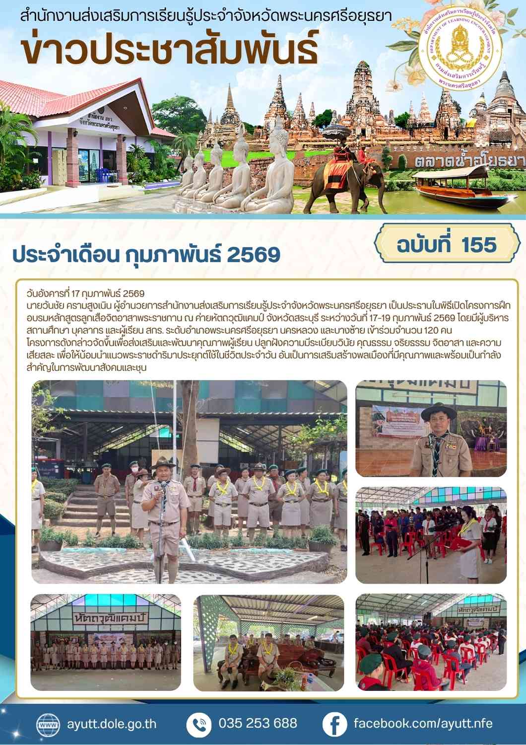 นายวันชัย ครามสูงเนิน ผู้อำนวยการสำนักงานส่งเสริมการเรียนรู้ประจำจังหวัดพระนครศรีอยุธยา เป็นประธานในพิธีเปิดโครงการฝึกอบรมหลักสูตรลูกเสือจิตอาสาพระราชทาน ณ ค่ายหัตถวุฒิแคมป์ จังหวัดสระบุรี ระหว่างวันที่ 17–19 กุมภาพันธ์ 2569 โดยมีผู้บริหารสถานศึกษา บุคลากร และผู้เรียน สกร. ระดับอำเภอพระนครศรีอยุธยา นครหลวง และบางซ้าย เข้าร่วมจำนวน 120 คน
