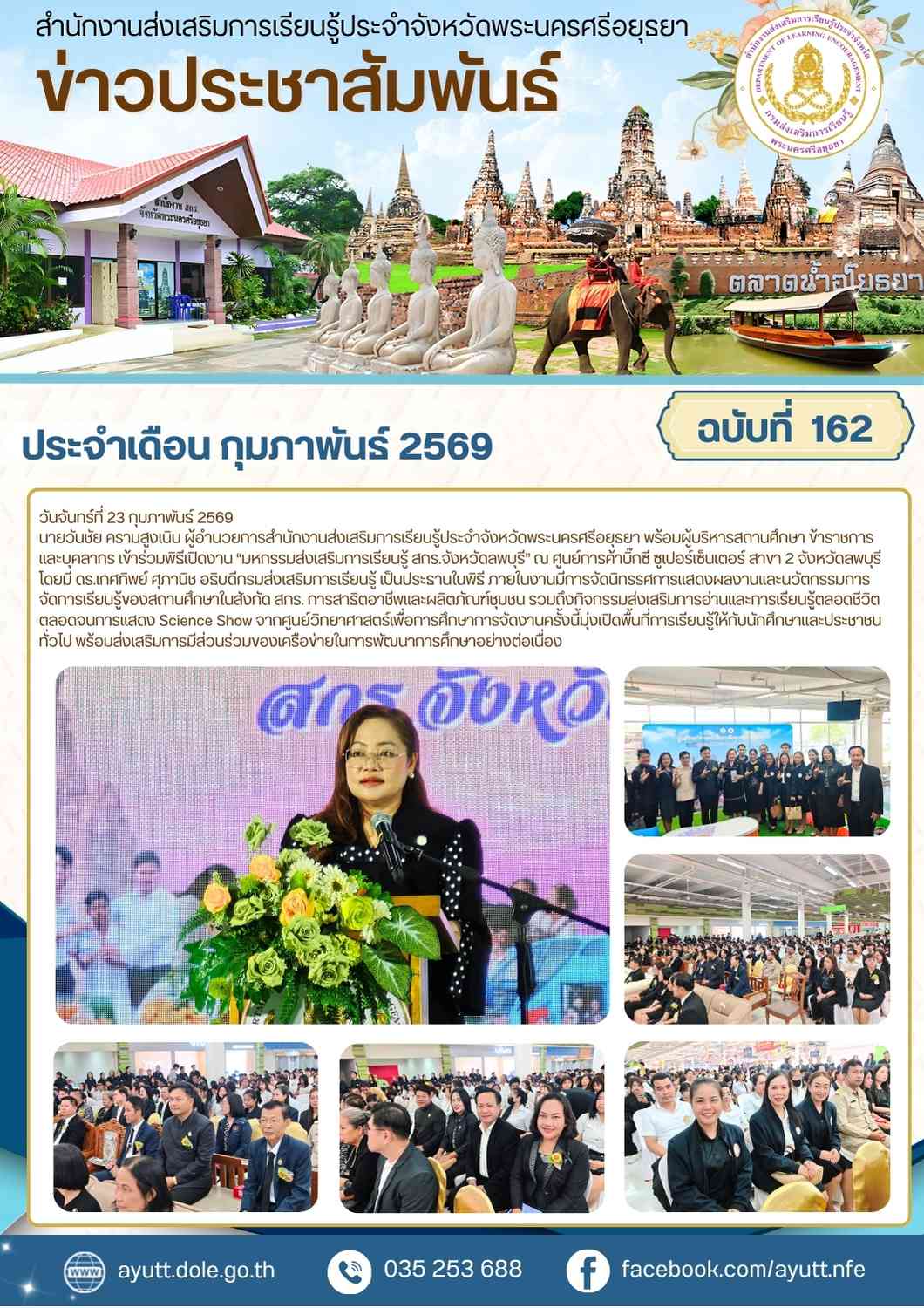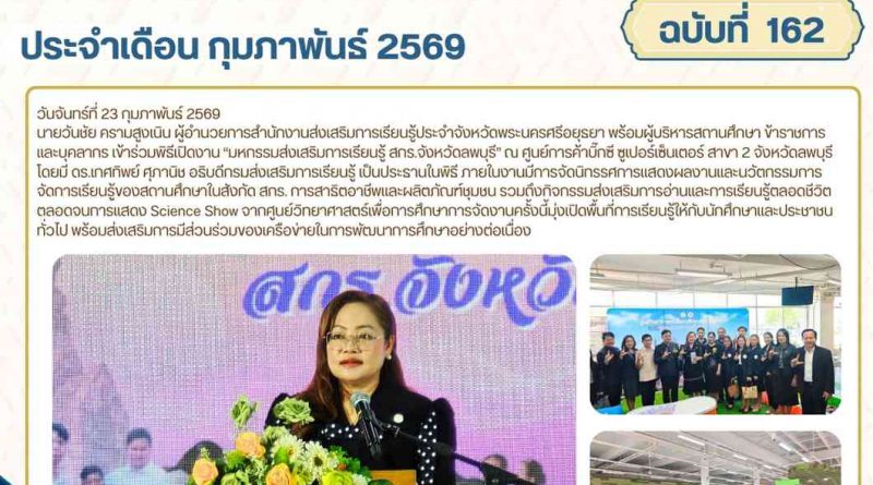 นายวันชัย ครามสูงเนิน ผู้อำนวยการสำนักงานส่งเสริมการเรียนรู้ประจำจังหวัดพระนครศรีอยุธยา พร้อมผู้บริหารสถานศึกษา ข้าราชการ และบุคลากร เข้าร่วมพิธีเปิดงาน “มหกรรมส่งเสริมการเรียนรู้ สกร.จังหวัดลพบุรี” ณ ศูนย์การค้าบิ๊กซี ซูเปอร์เซ็นเตอร์ สาขา 2 จังหวัดลพบุรี โดยมี ดร.เกศทิพย์ ศุภานิช อธิบดีกรมส่งเสริมการเรียนรู้ เป็นประธานในพิธี ภายในงานมีการจัดนิทรรศการแสดงผลงานและนวัตกรรมการจัดการเรียนรู้ของสถานศึกษาในสังกัด สกร. การสาธิตอาชีพและผลิตภัณฑ์ชุมชน รวมถึงกิจกรรมส่งเสริมการอ่านและการเรียนรู้ตลอดชีวิต ตลอดจนการแสดง Science Show จากศูนย์วิทยาศาสตร์เพื่อการศึกษาการจัดงานครั้งนี้มุ่งเปิดพื้นที่การเรียนรู้ให้กับนักศึกษาและประชาชนทั่วไป พร้อมส่งเสริมการมีส่วนร่วมของเครือข่ายในการพัฒนาการศึกษาอย่างต่อเนื่อง