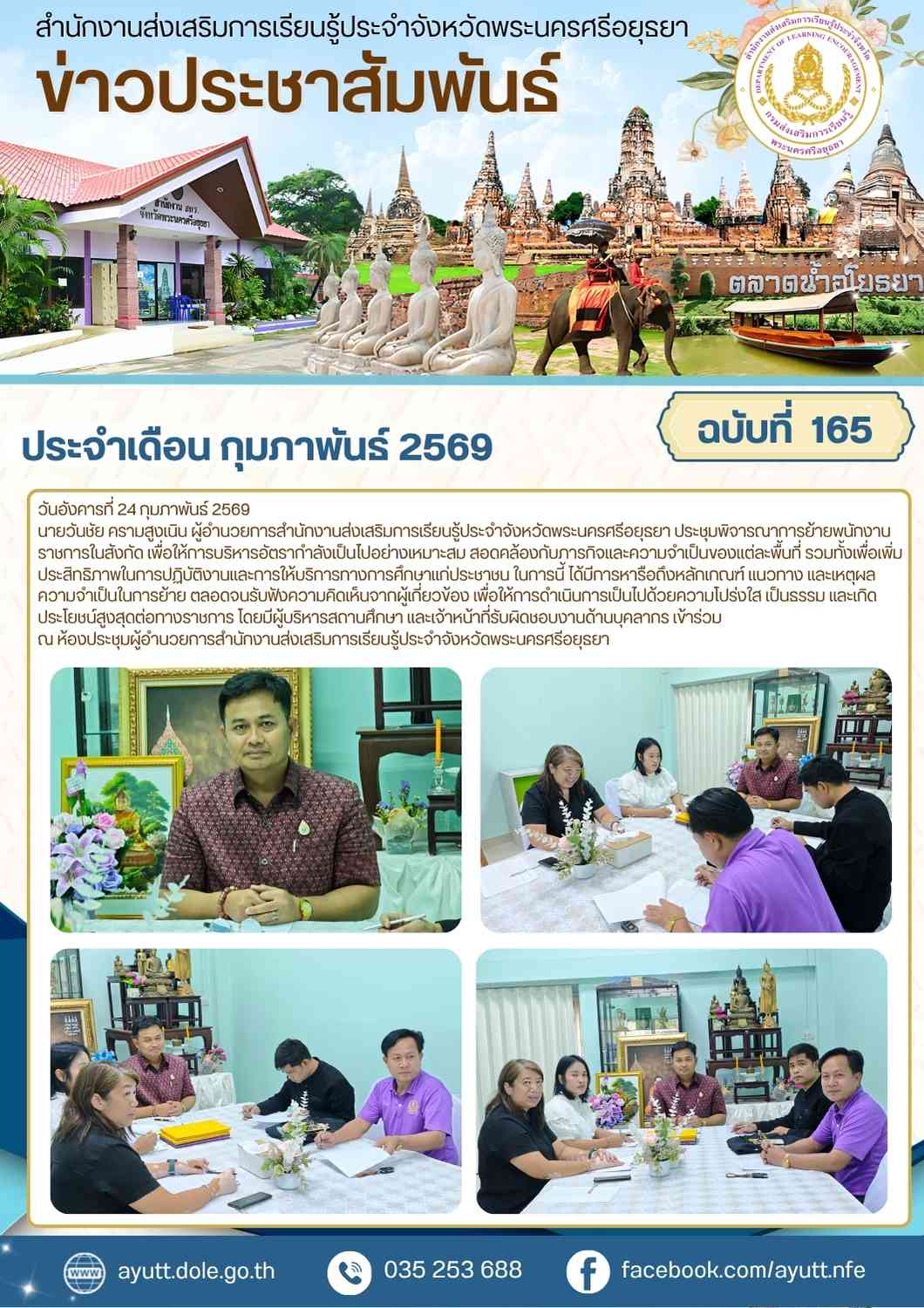 นายวันชัย ครามสูงเนิน ผู้อำนวยการสำนักงานส่งเสริมการเรียนรู้ประจำจังหวัดพระนครศรีอยุธยา ประชุมพิจารณาการย้ายพนักงานราชการในสังกัด เพื่อให้การบริหารอัตรากำลังเป็นไปอย่างเหมาะสม สอดคล้องกับภารกิจและความจำเป็นของแต่ละพื้นที่ รวมทั้งเพื่อเพิ่มประสิทธิภาพในการปฏิบัติงานและการให้บริการทางการศึกษาแก่ประชาชน ในการนี้ ได้มีการหารือถึงหลักเกณฑ์ แนวทาง และเหตุผลความจำเป็นในการย้าย ตลอดจนรับฟังความคิดเห็นจากผู้เกี่ยวข้อง เพื่อให้การดำเนินการเป็นไปด้วยความโปร่งใส เป็นธรรม และเกิดประโยชน์สูงสุดต่อทางราชการ โดยมีผู้บริหารสถานศึกษา และเจ้าหน้าที่รับผิดชอบงานด้านบุคลากร เข้าร่วม