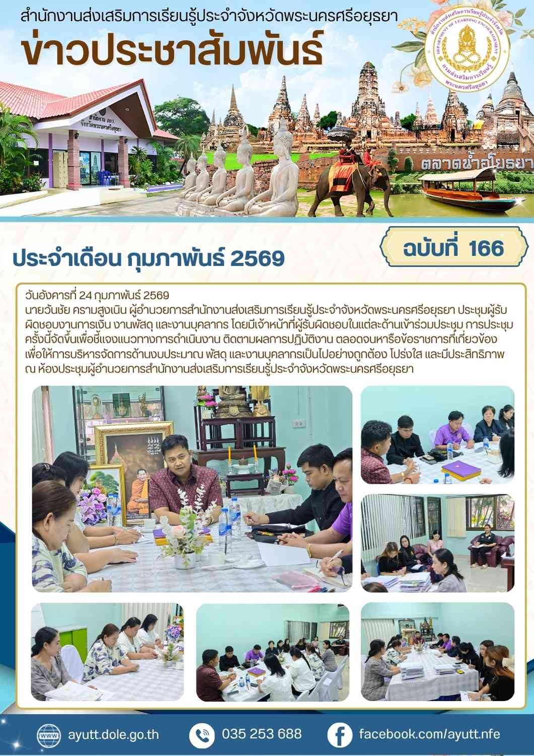 นายวันชัย ครามสูงเนิน ผู้อำนวยการสำนักงานส่งเสริมการเรียนรู้ประจำจังหวัดพระนครศรีอยุธยา ประชุมผู้รับผิดชอบงานการเงิน งานพัสดุ และงานบุคลากร โดยมีเจ้าหน้าที่ผู้รับผิดชอบในแต่ละด้านเข้าร่วมประชุม การประชุมครั้งนี้จัดขึ้นเพื่อชี้แจงแนวทางการดำเนินงาน ติดตามผลการปฏิบัติงาน ตลอดจนหารือข้อราชการที่เกี่ยวข้อง เพื่อให้การบริหารจัดการด้านงบประมาณ พัสดุ และงานบุคลากรเป็นไปอย่างถูกต้อง โปร่งใส และมีประสิทธิภาพ