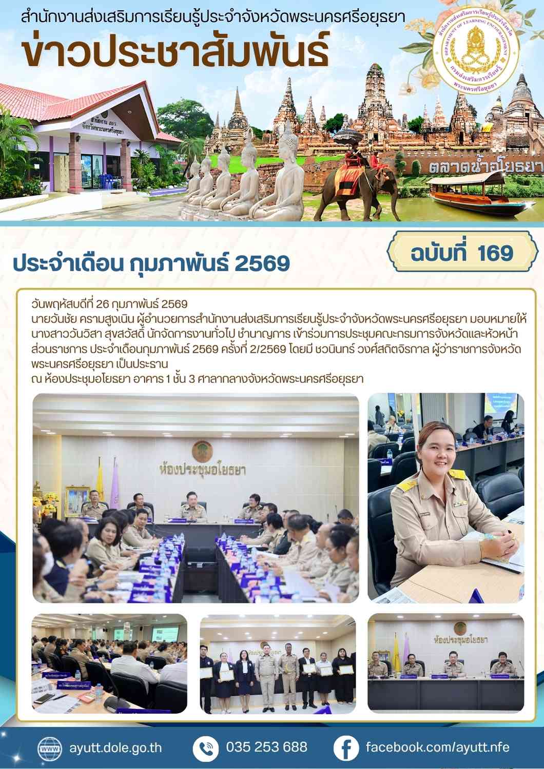 นายวันชัย ครามสูงเนิน ผู้อำนวยการสำนักงานส่งเสริมการเรียนรู้ประจำจังหวัดพระนครศรีอยุธยา มอบหมายให้ นางสาววันวิสา สุขสวัสดิ์ นักจัดการงานทั่วไป ชำนาญการ เข้าร่วมการประชุมคณะกรมการจังหวัดและหัวหน้าส่วนราชการ ประจำเดือนกุมภาพันธ์ 2569 ครั้งที่ 2/2569 โดยมี ชวนินทร์ วงศ์สถิตจิรกาล ผู้ว่าราชการจังหวัดพระนครศรีอยุธยา เป็นประธาน
