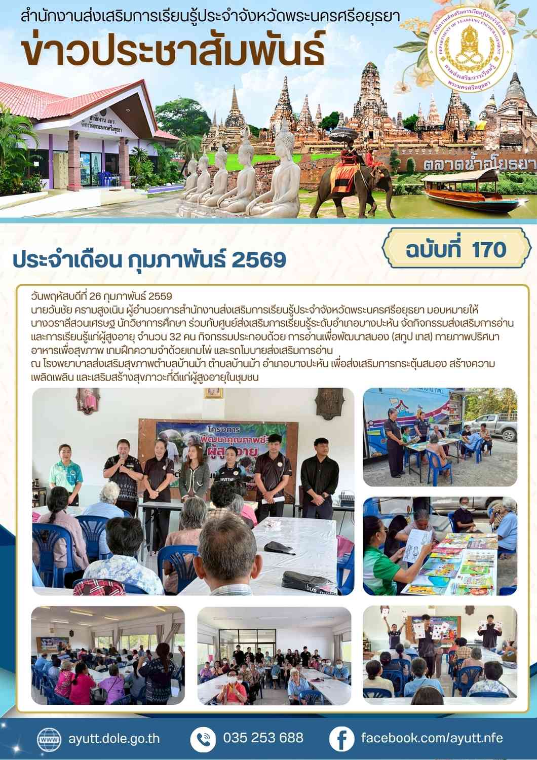 นายวันชัย ครามสูงเนิน ผู้อำนวยการสำนักงานส่งเสริมการเรียนรู้ประจำจังหวัดพระนครศรีอยุธยา มอบหมายให้ นางวราลีสวนเศรษฐ นักวิชาการศึกษา ร่วมกับศูนย์ส่งเสริมการเรียนรู้ระดับอำเภอบางปะหัน จัดกิจกรรมส่งเสริมการอ่านและการเรียนรู้แก่ผู้สูงอายุ จำนวน 32 คน กิจกรรมประกอบด้วย การอ่านเพื่อพัฒนาสมอง (สทูป เทส) ทายภาพปริศนาอาหารเพื่อสุขภาพ เกมฝึกความจำด้วยเกมไพ่ และรถโมบายส่งเสริมการอ่าน