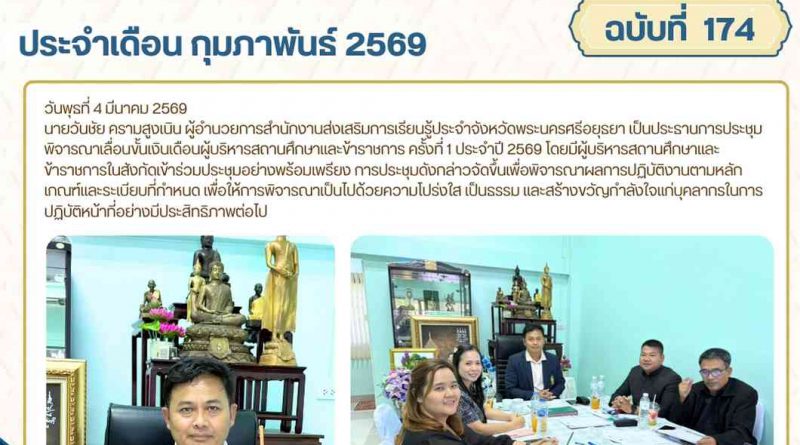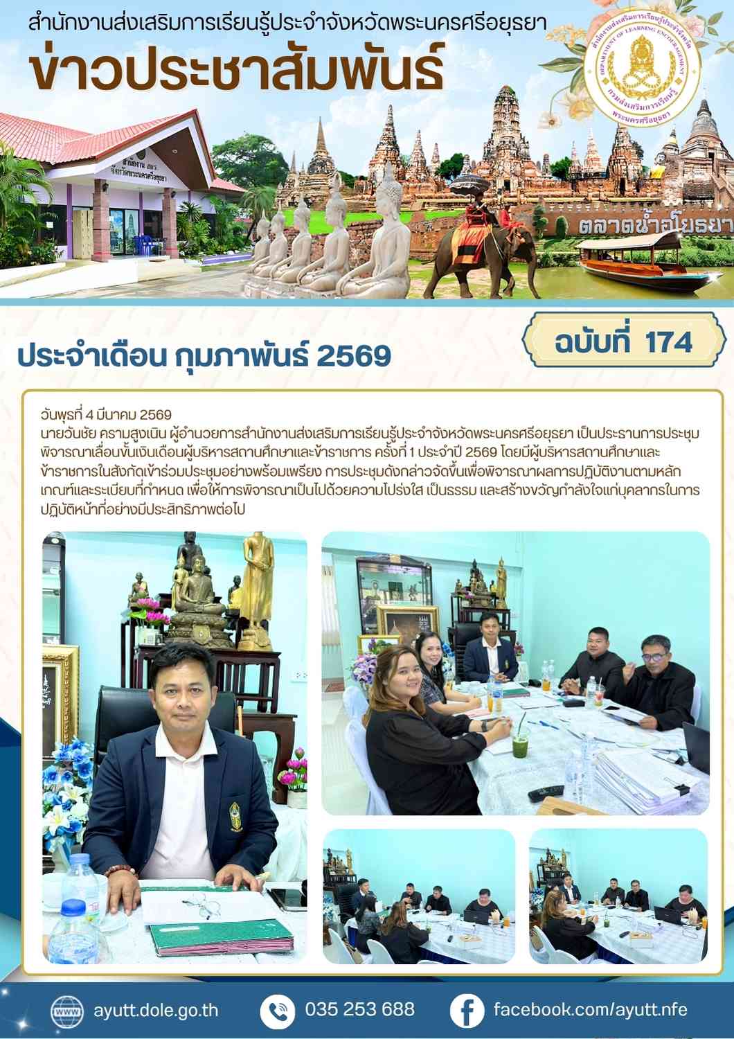นายวันชัย ครามสูงเนิน ผู้อำนวยการสำนักงานส่งเสริมการเรียนรู้ประจำจังหวัดพระนครศรีอยุธยา เป็นประธานการประชุมพิจารณาเลื่อนขั้นเงินเดือนผู้บริหารสถานศึกษาและข้าราชการ ครั้งที่ 1 ประจำปี 2569 โดยมีผู้บริหารสถานศึกษาและข้าราชการในสังกัดเข้าร่วมประชุมอย่างพร้อมเพรียง การประชุมดังกล่าวจัดขึ้นเพื่อพิจารณาผลการปฏิบัติงานตามหลักเกณฑ์และระเบียบที่กำหนด เพื่อให้การพิจารณาเป็นไปด้วยความโปร่งใส เป็นธรรม และสร้างขวัญกำลังใจแก่บุคลากรในการปฏิบัติหน้าที่อย่างมีประสิทธิภาพต่อไป