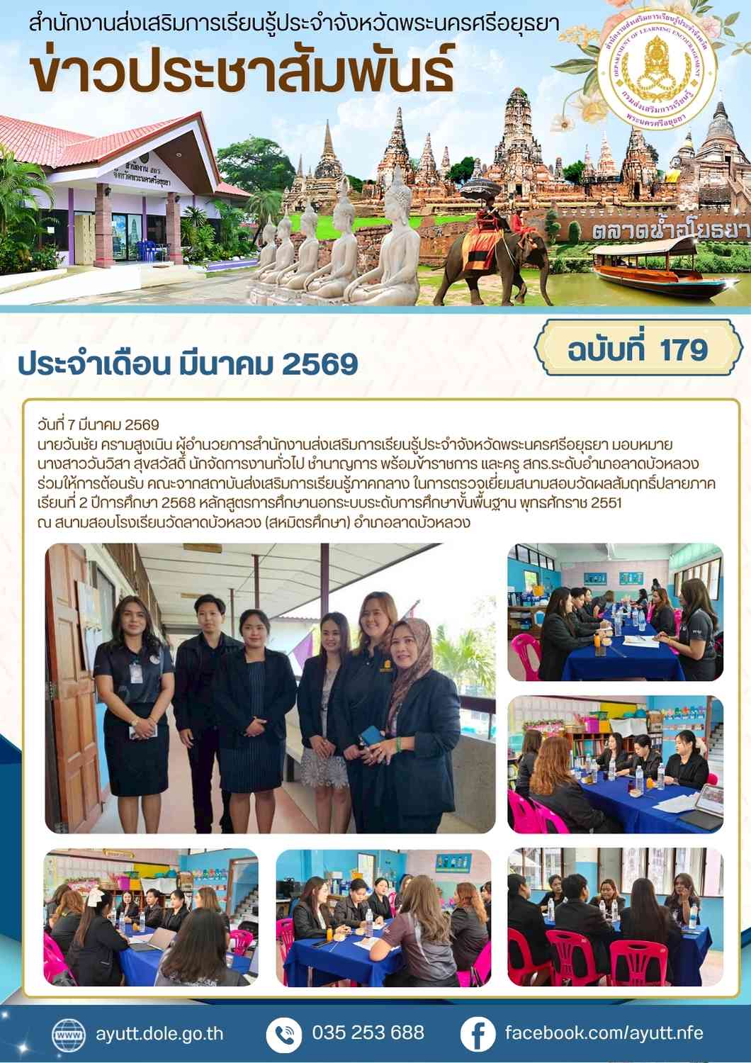 นายวันชัย ครามสูงเนิน ผู้อำนวยการสำนักงานส่งเสริมการเรียนรู้ประจำจังหวัดพระนครศรีอยุธยา มอบหมายนางสาววันวิสา สุขสวัสดิ์ นักจัดการงานทั่วไป ชำนาญการ พร้อมข้าราชการ และครู สกร.ระดับอำเภอลาดบัวหลวง ร่วมให้การต้อนรับ คณะจากสถาบันส่งเสริมการเรียนรู้ภาคกลาง ในการตรวจเยี่ยมสนามสอบวัดผลสัมฤทธิ์ปลายภาคเรียนที่ 2 ปีการศึกษา 2568 หลักสูตรการศึกษานอกระบบระดับการศึกษาขั้นพื้นฐาน พุทธศักราช 2551