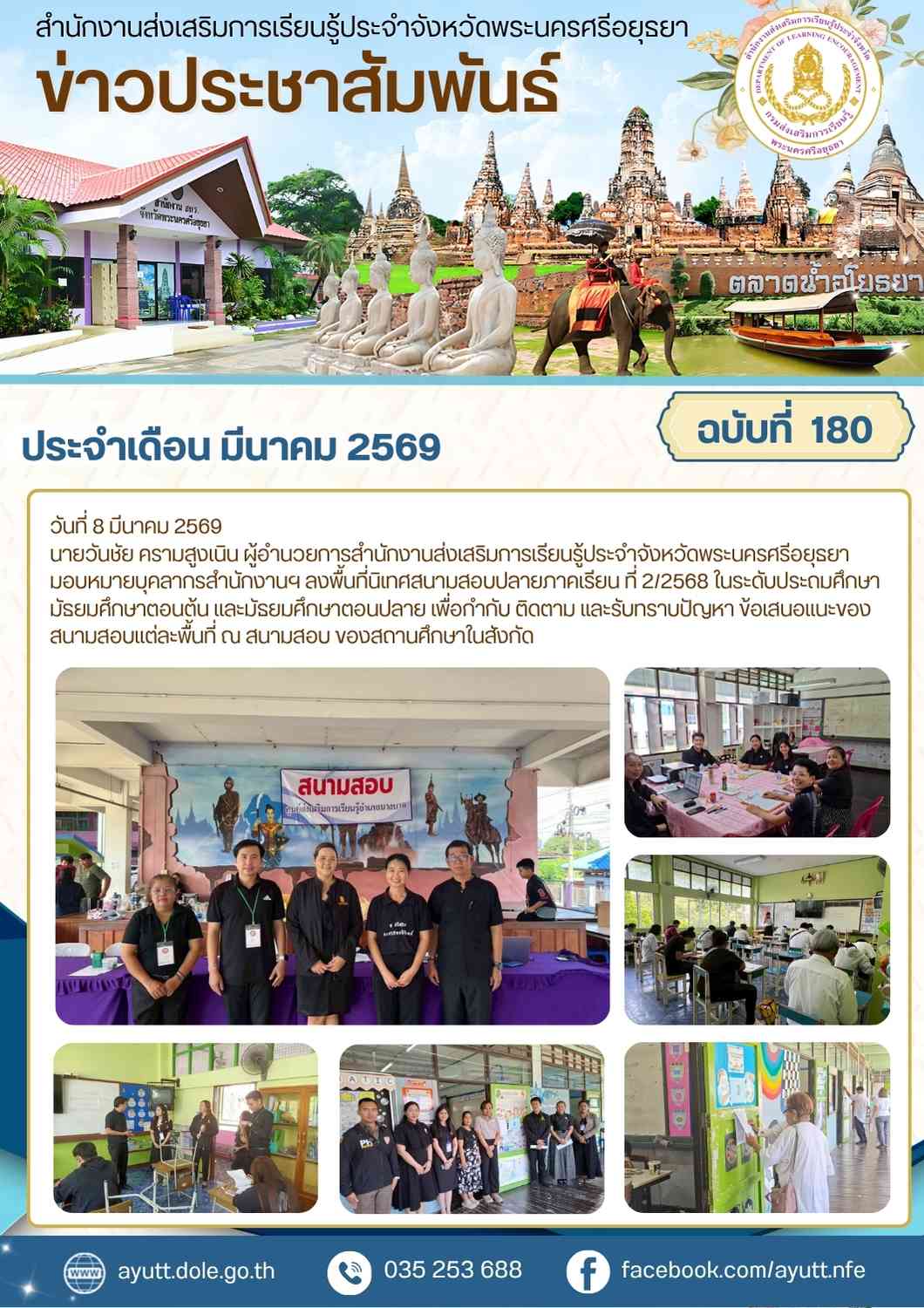 นายวันชัย ครามสูงเนิน ผู้อำนวยการสำนักงานส่งเสริมการเรียนรู้ประจำจังหวัดพระนครศรีอยุธยา มอบหมายบุคลากรสำนักงานฯ ลงพื้นที่นิเทศสนามสอบปลายภาคเรียน ที่ 2/2568 ในระดับประถมศึกษา มัธยมศึกษาตอนต้น และมัธยมศึกษาตอนปลาย เพื่อกำกับ ติดตาม และรับทราบปัญหา ข้อเสนอแนะของสนามสอบแต่ละพื้นที่ ณ สนามสอบ ของสถานศึกษาในสังกัด