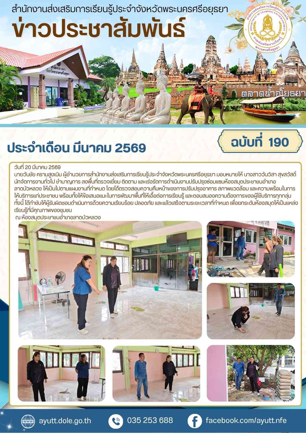นายวันชัย ครามสูงเนิน ผู้อำนวยการสํานักงานส่งเสริมการเรียนรู้ประจําจังหวัดพระนครศรีอยุธยา มอบหมายให้ นางสาววันวิสา สุขสวัสดิ์ นักจัดการงานทั่วไป ชำนาญการ ลงพื้นที่ตรวจเยี่ยม ติดตาม และเร่งรัดการดำเนินงานปรับปรุงซ่อมแซมห้องสมุดประชาชนอำเภอลาดบัวหลวง ให้เป็นไปตามแผนงานที่กำหนด โดยได้ตรวจสอบความคืบหน้าของการปรับปรุงอาคาร สภาพแวดล้อม และความพร้อมในการให้บริการแก่ประชาชน พร้อมทั้งให้ข้อเสนอแนะในการพัฒนาพื้นที่ให้เอื้อต่อการเรียนรู้ และตอบสนองความต้องการของผู้ใช้บริการทุกกลุ่ม ทั้งนี้ ได้กำชับให้ผู้รับผิดชอบดำเนินการด้วยความเรียบร้อย ปลอดภัย และแล้วเสร็จตามระยะเวลาที่กำหนด เพื่อยกระดับห้องสมุดให้เป็นแหล่งเรียนรู้ที่มีคุณภาพของชุมชน