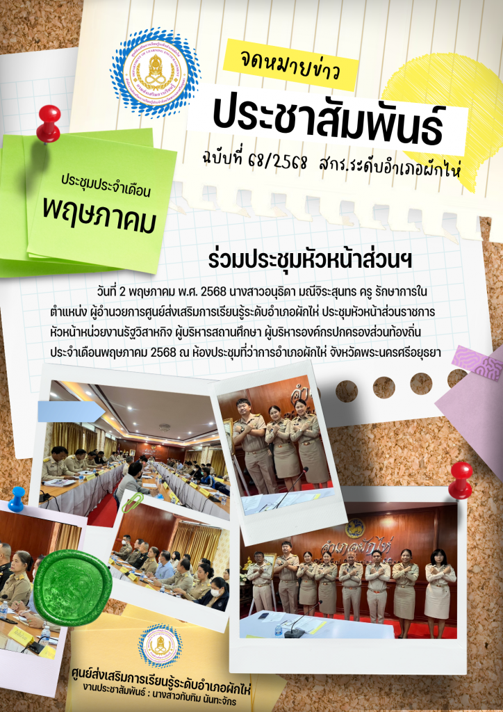 วันที่ 2 พฤษภาคม พ.ศ. 2568 นางสาวอนุธิดา มณีจิระสุนทร ครู รักษาการในตำแหน่ง ผู้อำนวยการศูนย์ส่งเสริมการเรียนรู้ระดับอำเภอผักไห่ ประชุมหัวหน้าส่วนราชการ หัวหน้าหน่วยงานรัฐวิสาหกิจ ผู้บริหารสถานศึกษา ผู้บริหารองค์กรปกครองส่วนท้องถิ่นประจำเดือนพฤษภาคม 2568 ณ ห้องประชุมที่ว่าการอำเภอผักไห่ จังหวัดพระนครศรีอยุธยา