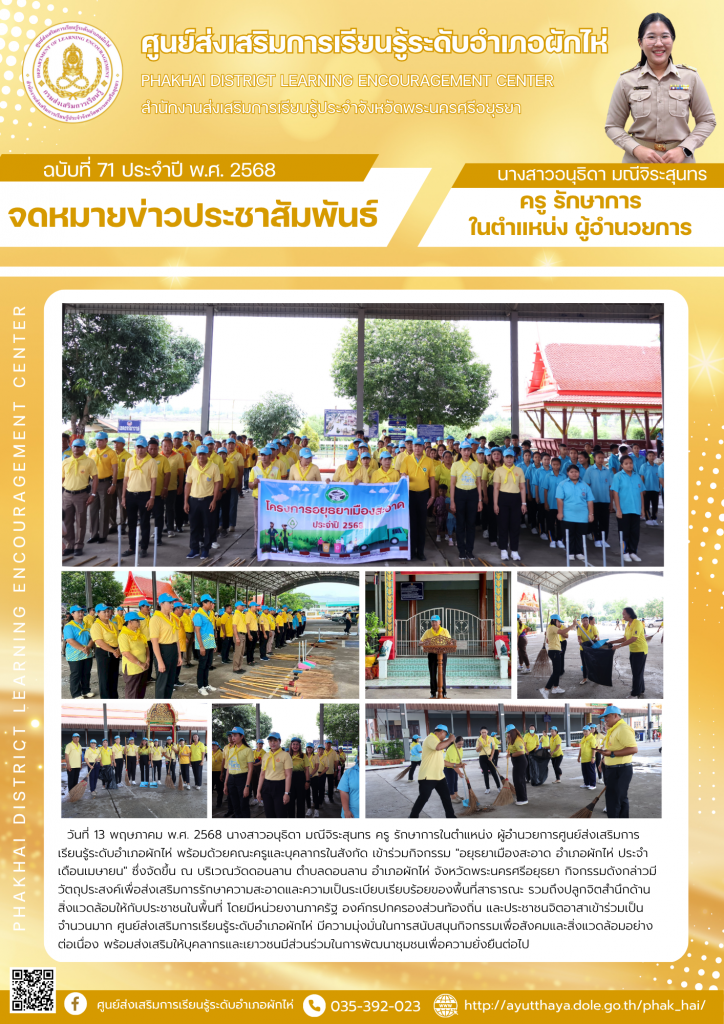 วันที่ 13 พฤษภาคม พ.ศ. 2568 นางสาวอนุธิดา มณีจิระสุนทร ครู รักษาการในตำแหน่ง ผู้อำนวยการศูนย์ส่งเสริมการเรียนรู้ระดับอำเภอผักไห่ พร้อมด้วยคณะครูและบุคลากรในสังกัด เข้าร่วมกิจกรรม “อยุธยาเมืองสะอาด อำเภอผักไห่ ประจำเดือนพฤษภาคม” ซึ่งจัดขึ้น ณ บริเวณวัดดอนลาน ตำบลดอนลาน อำเภอผักไห่ จังหวัดพระนครศรีอยุธยา กิจกรรมดังกล่าวมีวัตถุประสงค์เพื่อส่งเสริมการรักษาความสะอาดและความเป็นระเบียบเรียบร้อยของพื้นที่สาธารณะ รวมถึงปลูกจิตสำนึกด้านสิ่งแวดล้อมให้กับประชาชนในพื้นที่ โดยมีหน่วยงานภาครัฐ องค์กรปกครองส่วนท้องถิ่น และประชาชนจิตอาสาเข้าร่วมเป็นจำนวนมาก ศูนย์ส่งเสริมการเรียนรู้ระดับอำเภอผักไห่ มีความมุ่งมั่นในการสนับสนุนกิจกรรมเพื่อสังคมและสิ่งแวดล้อมอย่างต่อเนื่อง พร้อมส่งเสริมให้บุคลากรและเยาวชนมีส่วนร่วมในการพัฒนาชุมชนเพื่อความยั่งยืนต่อไป