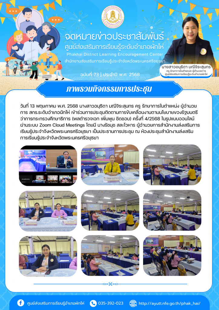 วันที่ 13 พฤษภาคม พ.ศ. 2568 นางสาวอนุธิดา มณีจิระสุนทร ครู รักษาการในตำแหน่ง ผู้อำนวยการ สกร.ระดับอำเภอผักไห่ เข้าร่วมการประชุมติดตามการขับเคลื่อนงานตามนโยบายของรัฐมนตรีว่าการกระทรวงศึกษาธิการ (พลตำรวจเอก เพิ่มพูน ชิดชอบ) ครั้งที่ 4/2568 ในรูปแบบออนไลน์ผ่านระบบ Zoom Cloud Meetings โดยมี นางรัชนุช สละโวหาร ผู้อำนวยการสำนักงานส่งเสริมการเรียนรู้ประจำจังหวัดพระนครศรีอยุธยา เป็นประธานการประชุม ณ ห้องประชุมสำนักงานส่งเสริมการเรียนรู้ประจำจังหวัดพระนครศรีอยุธยา