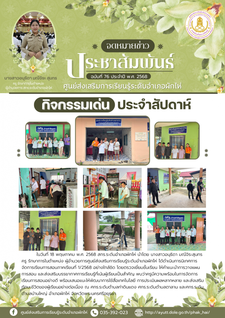 ในวันที่ 18 พฤษภาคม พ.ศ. 2568 สกร.ระดับอำเภอผักไห่ นำโดย นางสาวอนุธิดา มณีจิระสุนทร ครู รักษาการในตำแหน่ง ผู้อำนวยการศูนย์ส่งเสริมการเรียนรู้ระดับอำเภอผักไห่ ได้ดำเนินการนิเทศการจัดการเรียนการสอนภาคเรียนที่ 1/2568 อย่างใกล้ชิด โดยตรวจเยี่ยมชั้นเรียน ให้คำแนะนำการวางแผนการสอน และส่งเสริมบรรยากาศการเรียนรู้ที่เน้นผู้เรียนเป็นสำคัญ พบว่าครูมีความพร้อมในการจัดการเรียนการสอนอย่างดี พร้อมเสนอแนะให้พัฒนาการใช้สื่อเทคโนโลยี การประเมินผลหลากหลาย และส่งเสริมทักษะชีวิตของผู้เรียนอย่างต่อเนื่อง ณ ศกร.ระดับตำบลท่าดินแดง ศกร.ระดับตำบลตาลาน และศกร.ระดับตำบลบ้านใหญ่ อำเภอผักไห่ จังหวัดพระนครศรีอยุธยา