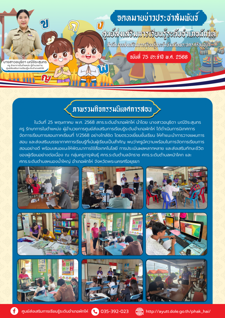 ในวันที่ 25 พฤษภาคม พ.ศ. 2568 สกร.ระดับอำเภอผักไห่ นำโดย นางสาวอนุธิดา มณีจิระสุนทร ครู รักษาการในตำแหน่ง ผู้อำนวยการศูนย์ส่งเสริมการเรียนรู้ระดับอำเภอผักไห่ ได้ดำเนินการนิเทศการจัดการเรียนการสอนภาคเรียนที่ 1/2568 อย่างใกล้ชิด โดยตรวจเยี่ยมชั้นเรียน ให้คำแนะนำการวางแผนการสอน และส่งเสริมบรรยากาศการเรียนรู้ที่เน้นผู้เรียนเป็นสำคัญ พบว่าครูมีความพร้อมในการจัดการเรียนการสอนอย่างดี พร้อมเสนอแนะให้พัฒนาการใช้สื่อเทคโนโลยี การประเมินผลหลากหลาย และส่งเสริมทักษะชีวิตของผู้เรียนอย่างต่อเนื่อง ณ กลุ่มครูจารุพันธุ์ ศกร.ระดับตำบลจักราช ศกร.ระดับตำบลหน้าโคก และศกร.ระดับตำบลหนองน้ำใหญ่ อำเภอผักไห่ จังหวัดพระนครศรีอยุธยา