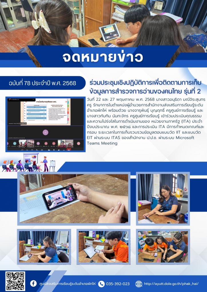 วันที่ 22 และ 27 พฤษภาคม พ.ศ. 2568 นางสาวอนุธิดา มณีจิระสุนทร ครู รักษาการในตำแหน่งผู้อำนวยการสำนักงานส่งเสริมการเรียนรู้ระดับอำเภอผักไห่ พร้อมด้วย นางจารุพันธุ์ บุญฤทธิ์ ครูศูนย์การเรียนรู้ และ นางสาวทับทิม นันทะจักร ครูศูนย์การเรียนรู้ เข้าร่วมประเมินคุณธรรมและความโปร่งใสในการดำเนินงานของ หน่วยงานภาครัฐ (ITA) ประจำปีงบประมาณ พ.ศ. ๒๕๖๘ และการประเมิน ITA มีการกำหนดเกณฑ์และกรอบ ระยะเวลาในการเก็บรวบรวมข้อมูลตอบแบบวัด IIT และแบบวัด EIT ผ่านระบบ ITAS ของสำนักงาน ป.ป.ช. ผ่านระบบ Microsoft Teams Meeting