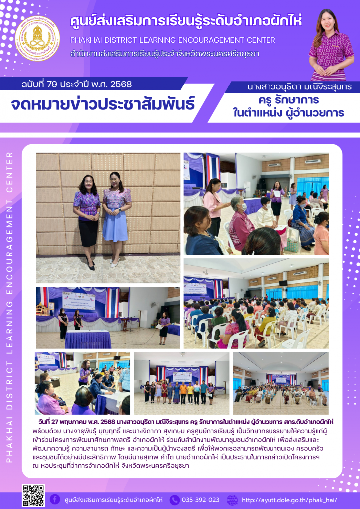 วันที่ 27 พฤษภาคม พ.ศ. 2568 นางสาวอนุธิดา มณีจิระสุนทร ครู รักษาการในตำแหน่ง ผู้อำนวยการ สกร.ดับอำเภอผักไห่ พร้อมด้วย นางจารุพันธุ์ บุญฤทธิ์ และนางจิดาภา สุขเกษม ครูศูนย์การเรียนรู้ เป็นวิทยากรบรรยายให้ความรู้แก่ผู้เข้าร่วมโครงการพัฒนาศักยภาพสตรี อำเภอผักไห้ ร่วมกับสำนักงานพัฒนาชุมชนอำเภอผักไห่ เพื่อส่งเสริมและพัฒนาความรู้ ความสามารถ ทักษะ และความเป็นผู้นำของสตรี เพื่อให้พวกเธอสามารถพัฒนาตนเอง ครอบครัว และชุมชนได้อย่างมีประสิทธิภาพ โดยมีนายสุเทพ คำโต นายอำเภอผักไห่ เป็นประธานในการกล่าวเปิดโครงการฯ ณ หอประชุมที่ว่าการอำเภอผักไห่ จังหวัดพระนครศรีอยุธยา