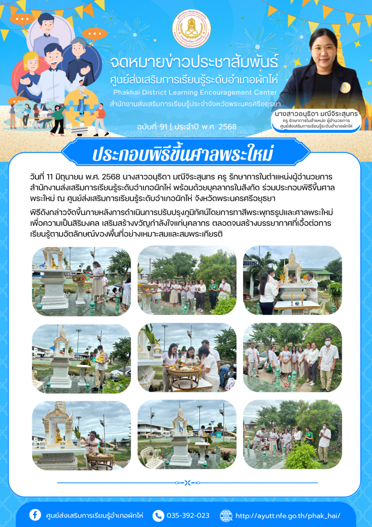 วันที่ 11 มิถุนายน พ.ศ. 2568 นางสาวอนุธิดา มณีจิระสุนทร ครู รักษาการในตำแหน่งผู้อำนวยการสำนักงานส่งเสริมการเรียนรู้ระดับอำเภอผักไห่ พร้อมด้วยบุคลากรในสังกัด ร่วมประกอบพิธีขึ้นศาลพระใหม่ ณ ศูนย์ส่งเสริมการเรียนรู้ระดับอำเภอผักไห่ จังหวัดพระนครศรีอยุธยา