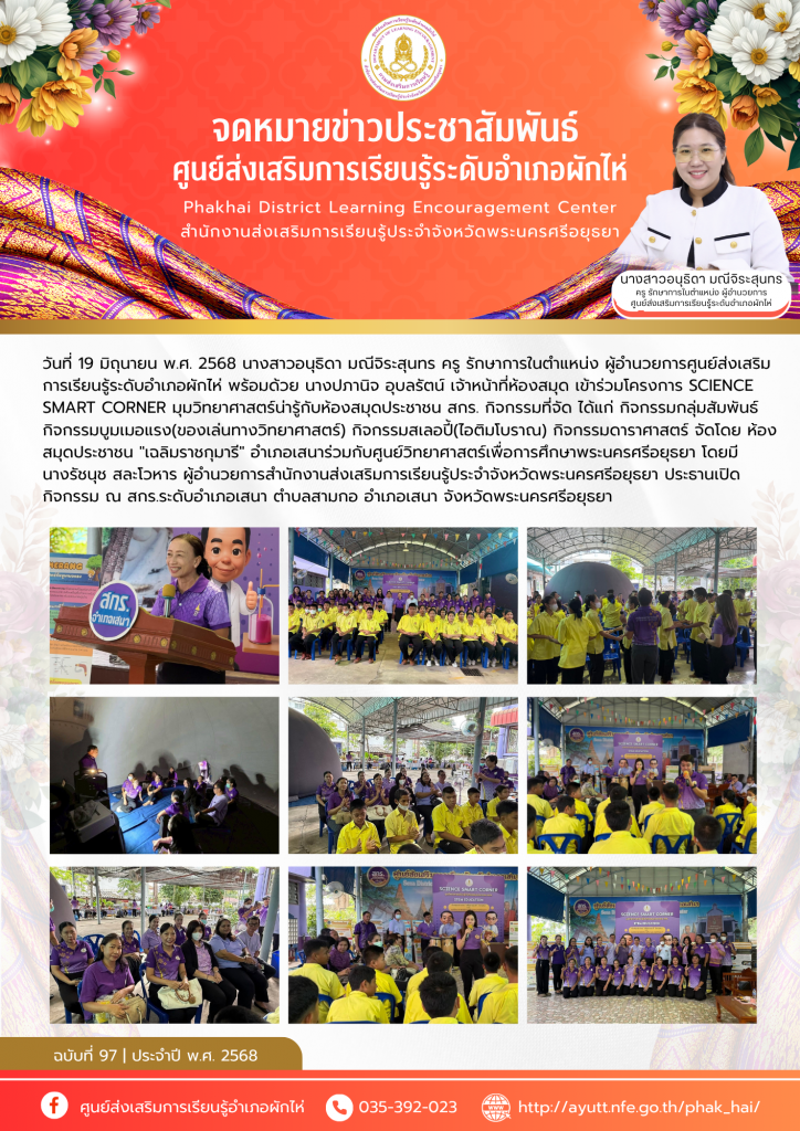 วันที่ 19 มิถุนายน พ.ศ. 2568 นางสาวอนุธิดา มณีจิระสุนทร ครู รักษาการในตำแหน่ง ผู้อำนวยการศูนย์ส่งเสริมการเรียนรู้ระดับอำเภอผักไห่ พร้อมด้วย นางปภานิจ อุบลรัตน์ เจ้าหน้าที่ห้องสมุด เข้าร่วมโครงการ Science Smart Corner มุมวิทยาศาสตร์น่ารู้กับห้องสมุดประชาชน สกร. กิจกรรมที่จัด ได้แก่ กิจกรรมกลุ่มสัมพันธ์ กิจกรรมบูมเมอแรง(ของเล่นทางวิทยาศาสตร์) กิจกรรมสเลอปี้(ไอติมโบราณ) กิจกรรมดาราศาสตร์ จัดโดย ห้องสมุดประชาชน “เฉลิมราชกุมารี” อำเภอเสนาร่วมกับศูนย์วิทยาศาสตร์เพื่อการศึกษาพระนครศรีอยุธยา โดยมี นางรัชนุช สละโวหาร ผู้อำนวยการสำนักงานส่งเสริมการเรียนรู้ประจำจังหวัดพระนครศรีอยุธยา ประธานเปิดกิจกรรม ณ สกร.ระดับอำเภอเสนา ตำบลสามกอ อำเภอเสนา จังหวัดพระนครศรีอยุธยา